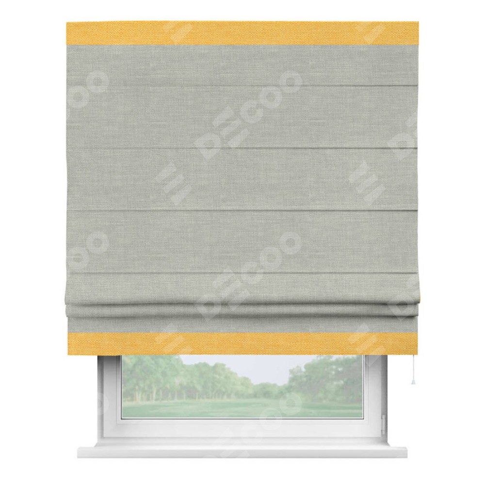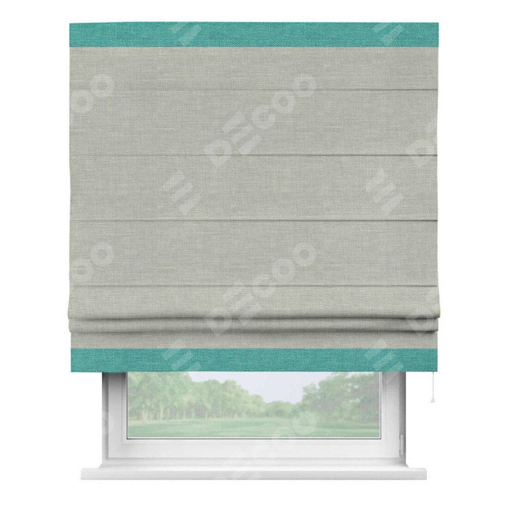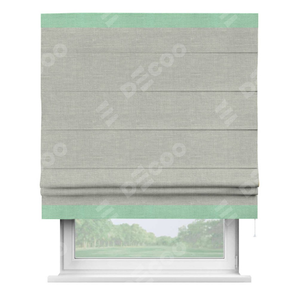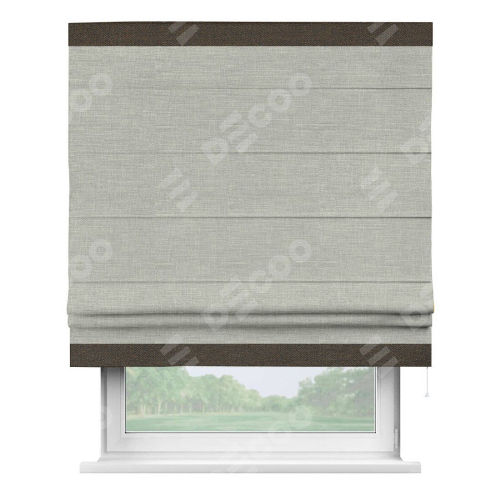 Римская штора производителя «Cortin», используется для проёма, пошита из ткани лён серый, артикул 7440. Отделка шторы кантом «Горизонт», ткань для канта используется из льна разной расцветки на выбор. Имеет универсальный механизм и подходит для монтажа: на потолок, на стену и в нишу.