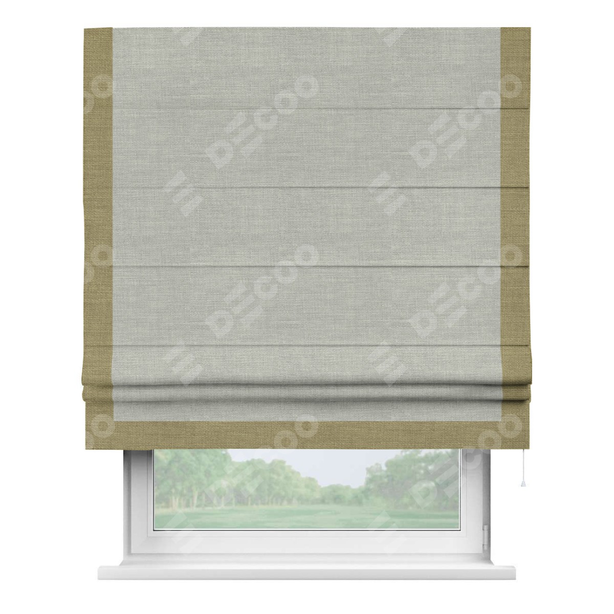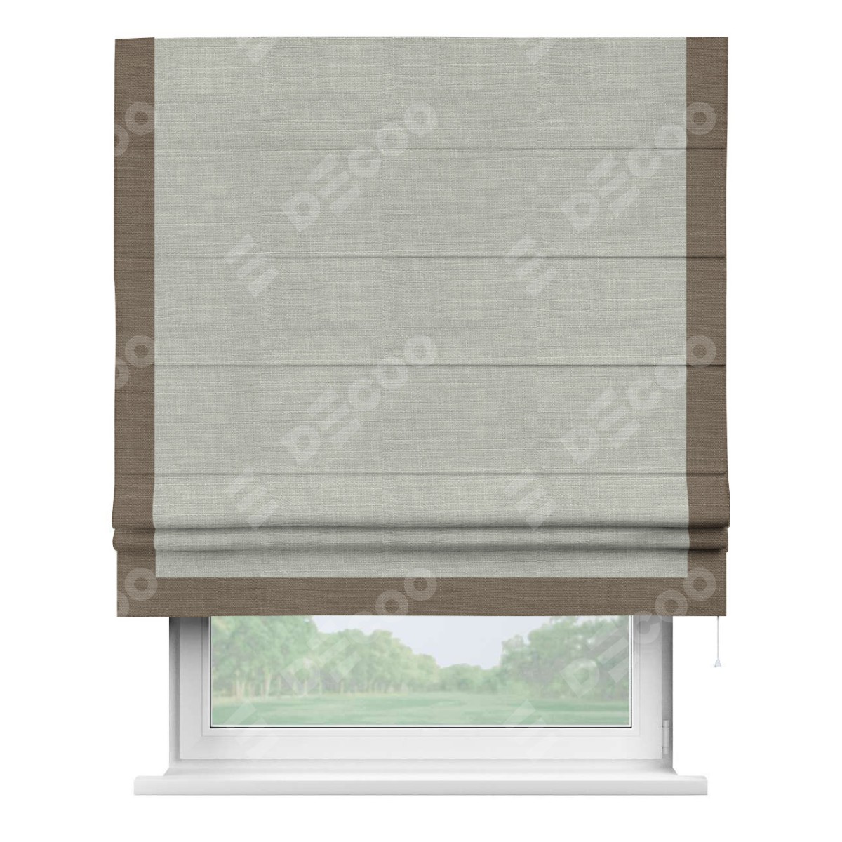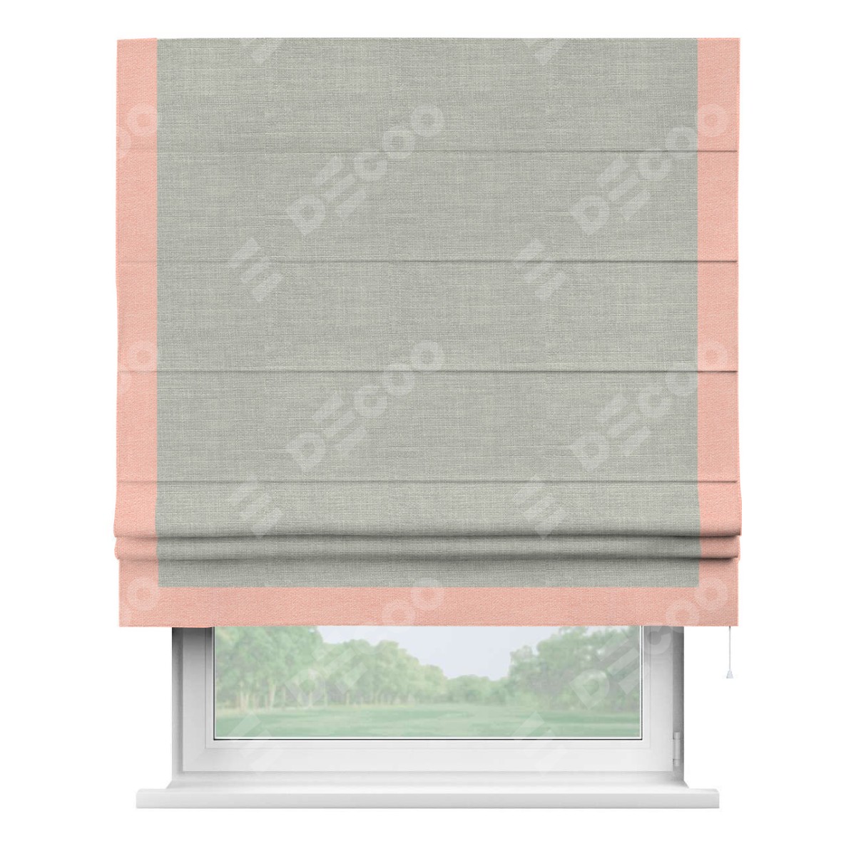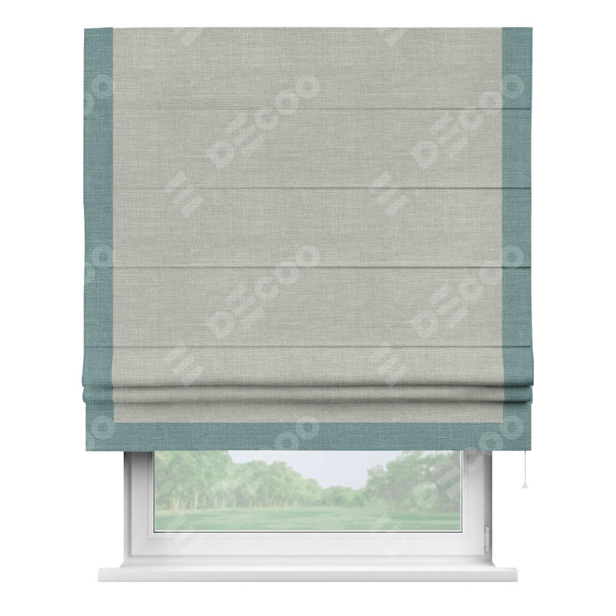 Римская штора производителя «Cortin», используется для проёма, пошита из ткани лён серый, артикул 7440. Отделка шторы кантом «Виктория», ткань для канта используется из льна разной расцветки на выбор. Имеет универсальный механизм и подходит для монтажа: на потолок, на стену и в нишу.