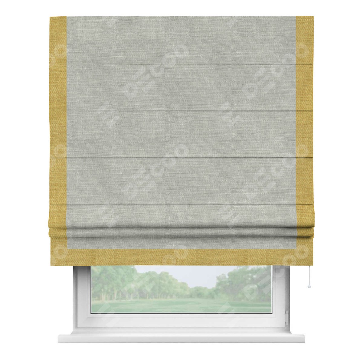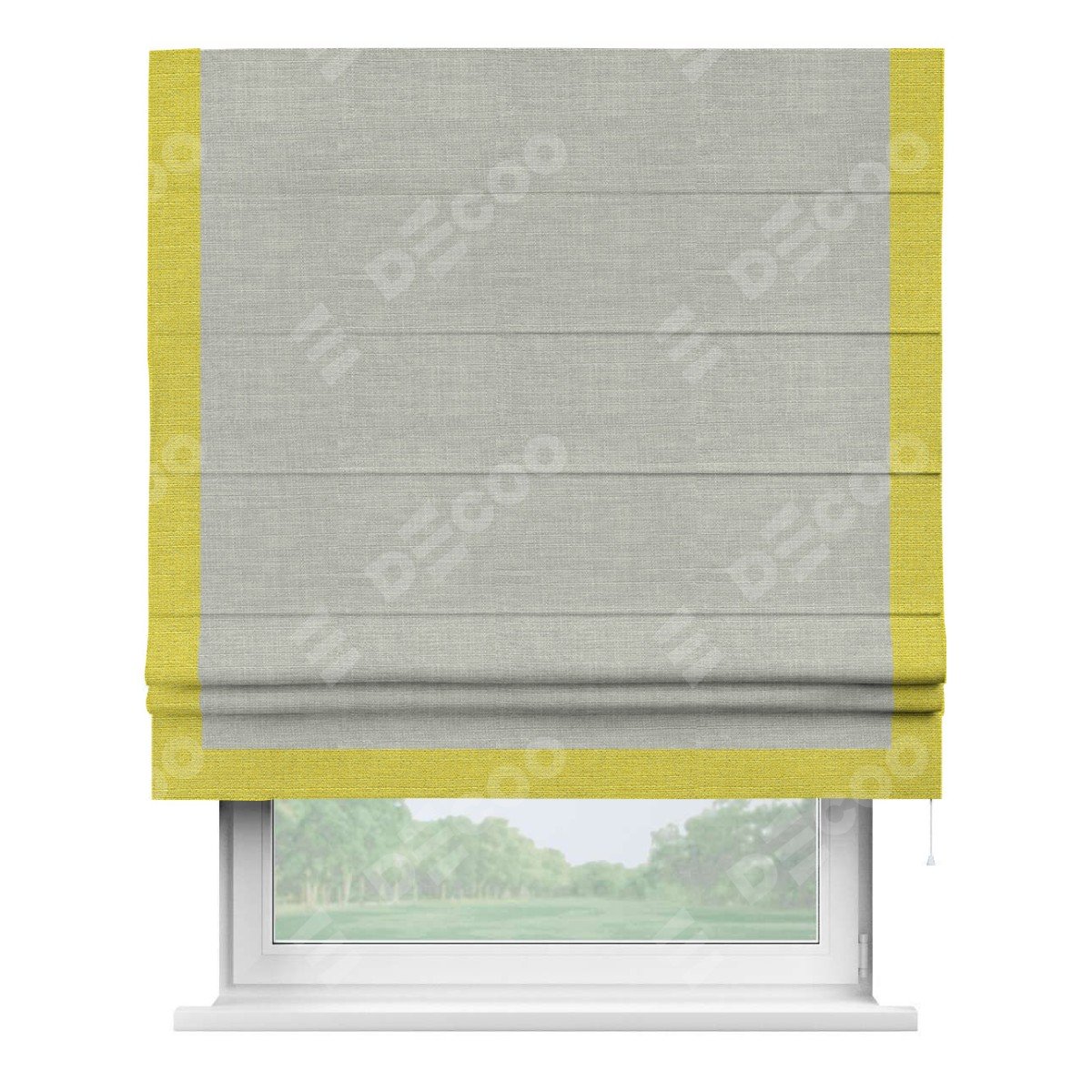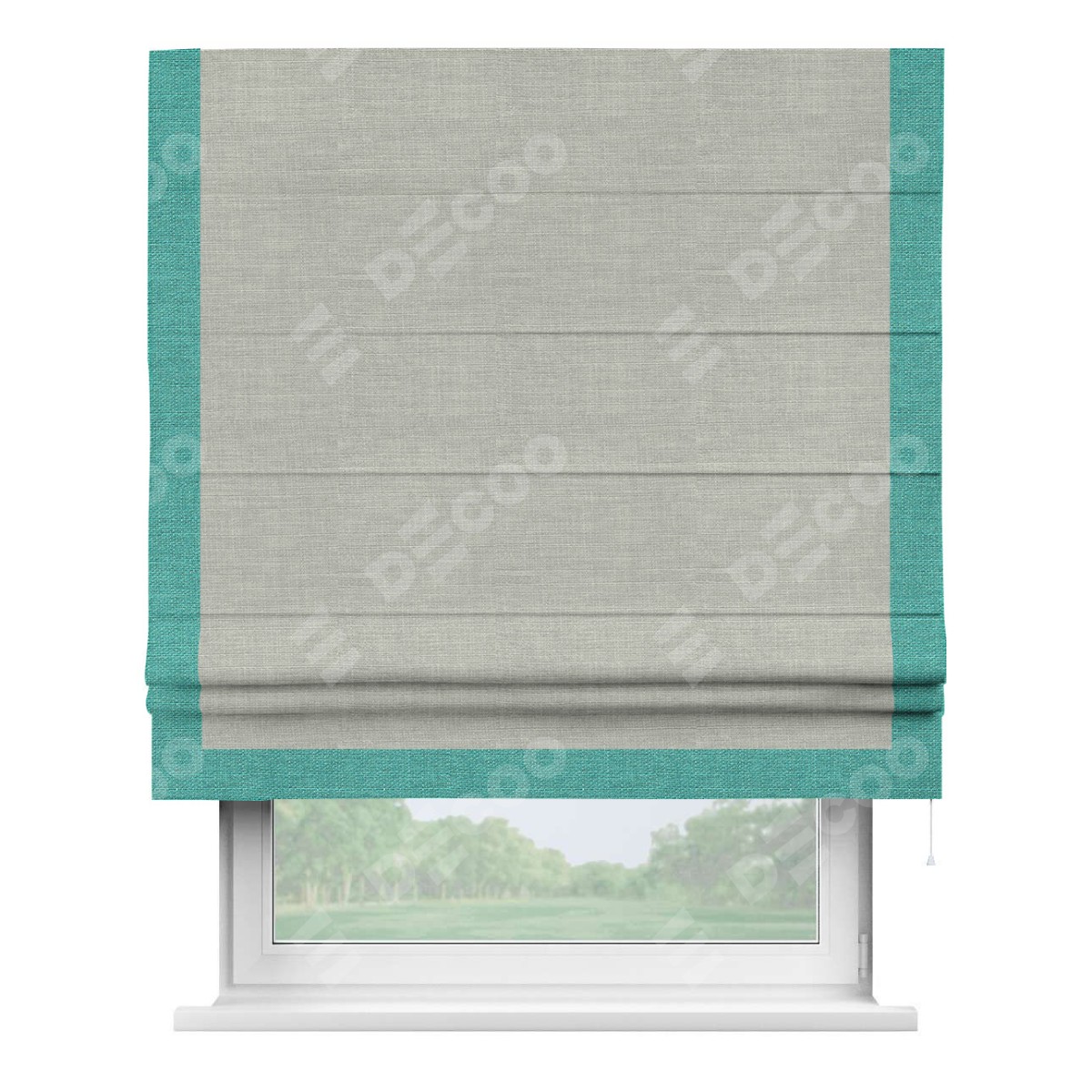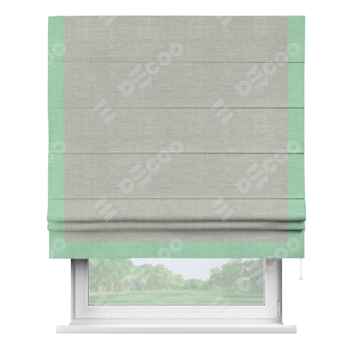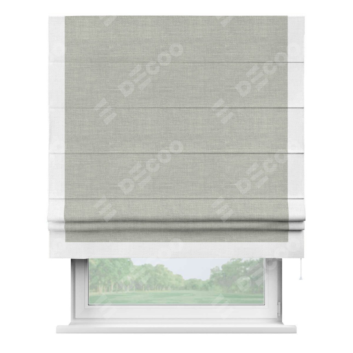 Римская штора производителя «Cortin», используется для проёма, пошита из ткани лён серый, артикул 7440. Отделка шторы кантом «Виктория», ткань для канта используется из льна разной расцветки на выбор. Имеет универсальный механизм и подходит для монтажа: на потолок, на стену и в нишу.