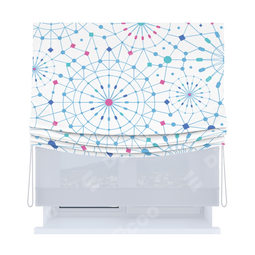 Римская штора день-ночь производителя «Cortin», используется для проёма, пошита из двух полотен, с лицевой блэкаут с нанесением сублимационной печати «Круги и линии», вторая ткань тюль (по стандарту комплектуется тюль белого цвета артикул V-01). Имеет универсальный механизм и подходит для монтажа: на потолок, на стену и в нишу. Удобное управление каждой шторой отдельно.
