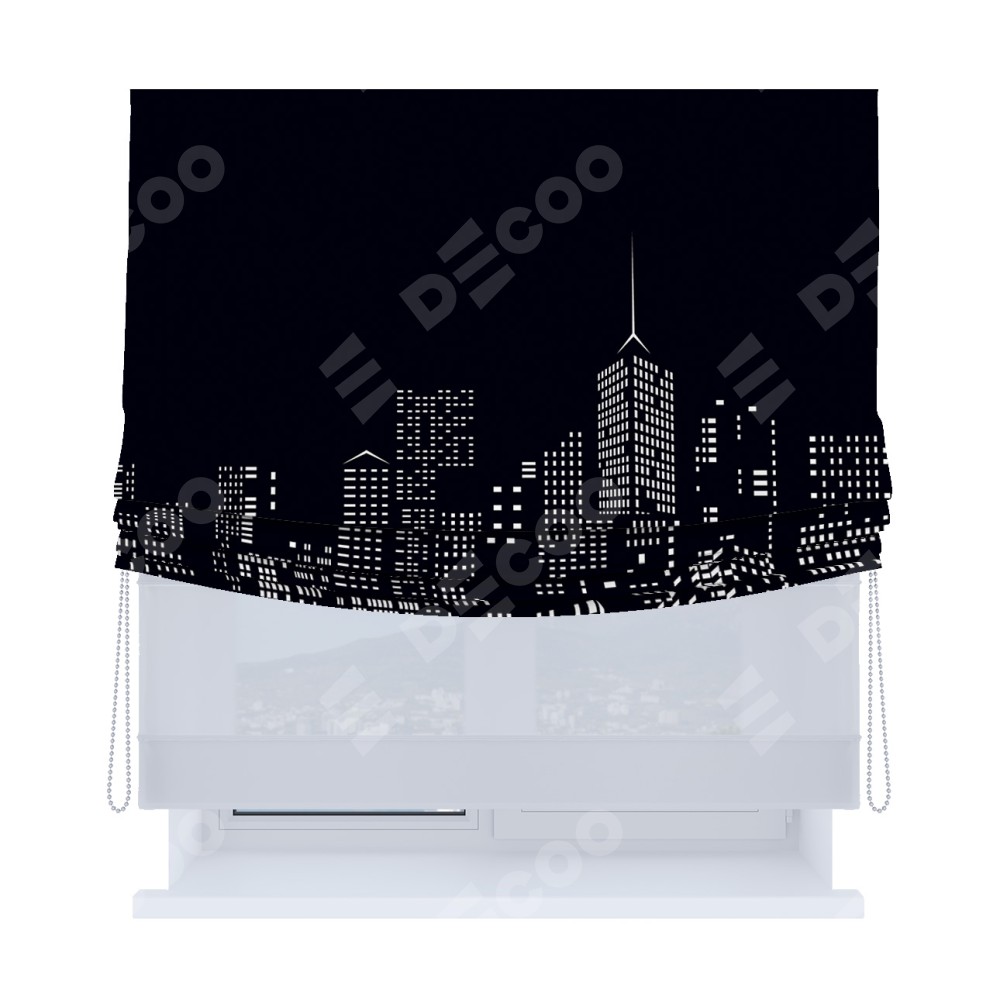 Римская штора день-ночь производителя «Cortin», используется для проёма, пошита из двух полотен, с лицевой блэкаут с нанесением сублимационной печати «Ночной город», вторая ткань тюль (по стандарту комплектуется тюль белого цвета артикул V-01). Имеет универсальный механизм и подходит для монтажа: на потолок, на стену и в нишу. Удобное управление каждой шторой отдельно.