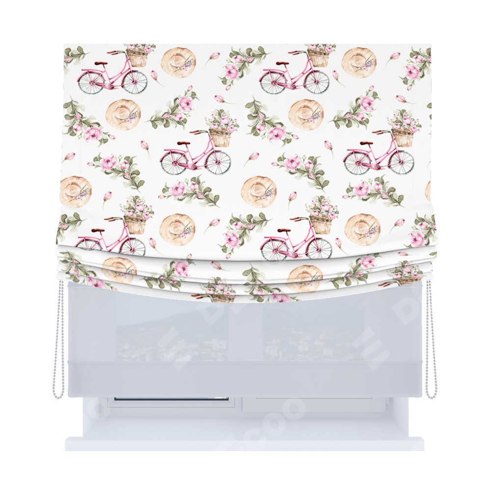 Римская штора день-ночь производителя «Cortin», используется для проёма, пошита из двух полотен, с лицевой блэкаут с нанесением сублимационной печати «Розовый велосипед», вторая ткань тюль (по стандарту комплектуется тюль белого цвета артикул V-01). Имеет универсальный механизм и подходит для монтажа: на потолок, на стену и в нишу. Удобное управление каждой шторой отдельно.