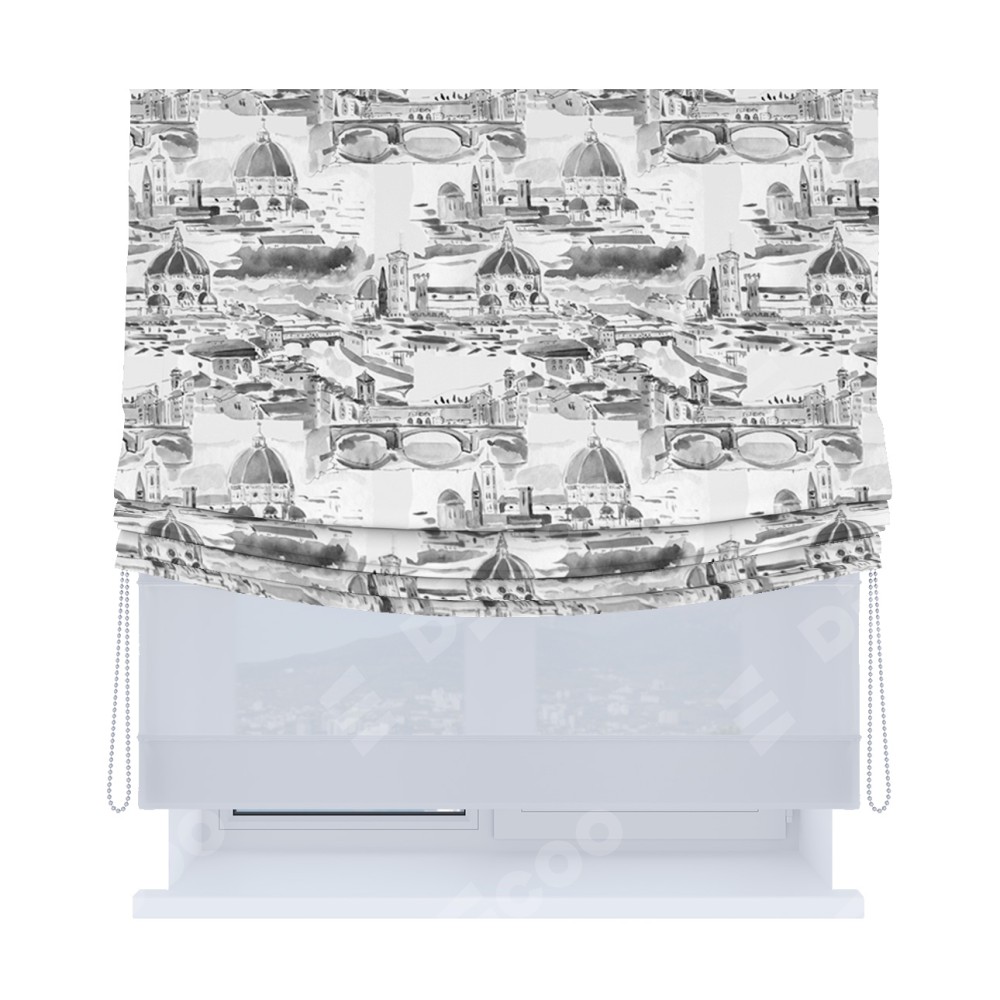 Римская штора день-ночь производителя «Cortin», используется для проёма, пошита из двух полотен, с лицевой блэкаут с нанесением сублимационной печати «Старый город», вторая ткань тюль (по стандарту комплектуется тюль белого цвета артикул V-01). Имеет универсальный механизм и подходит для монтажа: на потолок, на стену и в нишу. Удобное управление каждой шторой отдельно.