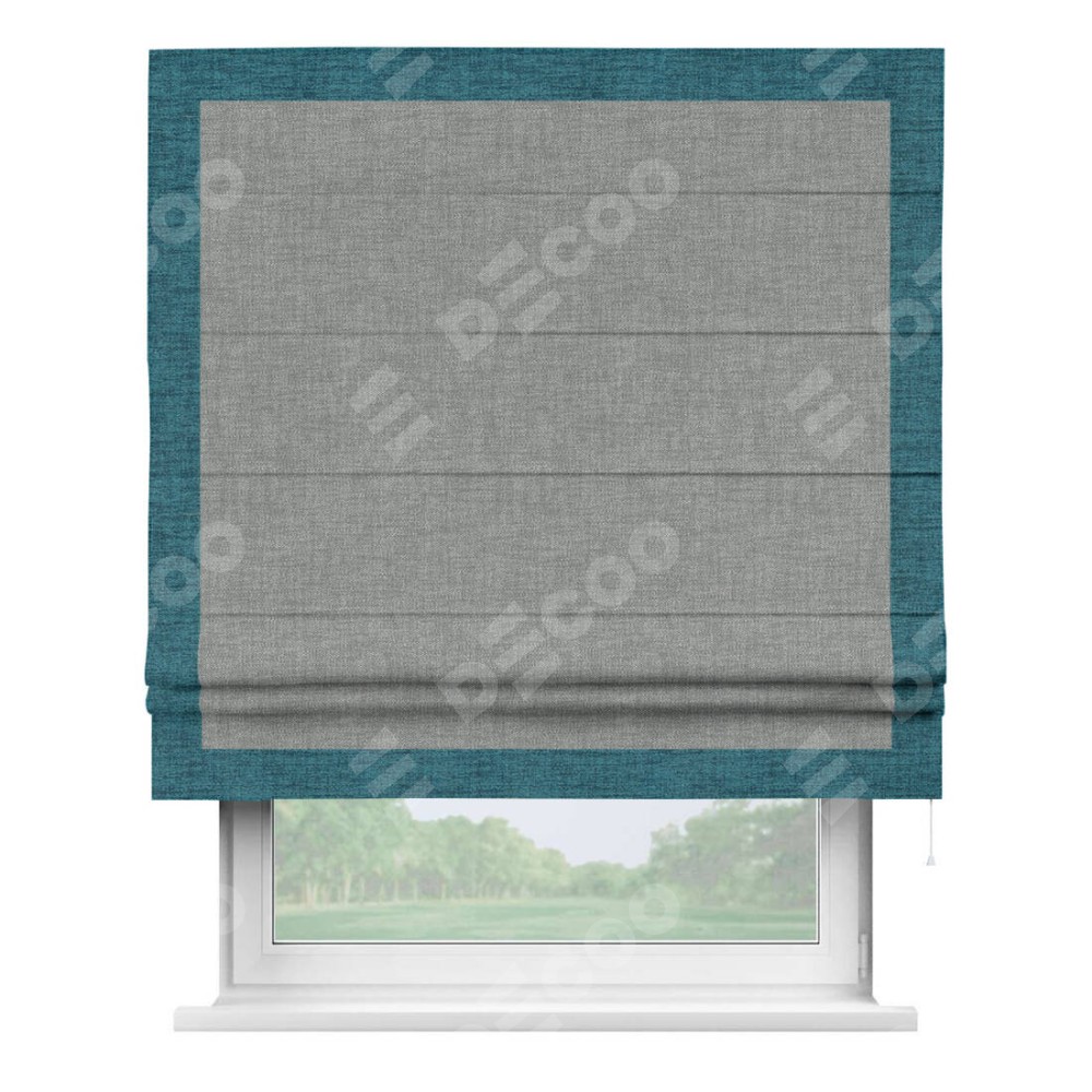 Римская штора производителя «Cortin», используется для проёма, пошита из ткани рогожка димаут тёмно-серый, артикул 80418. Отделка шторы кантом «Чесс», ткань для канта используется из рогожки димаут разной расцветки на выбор. Имеет универсальный механизм и подходит для монтажа: на потолок, на стену и в нишу.