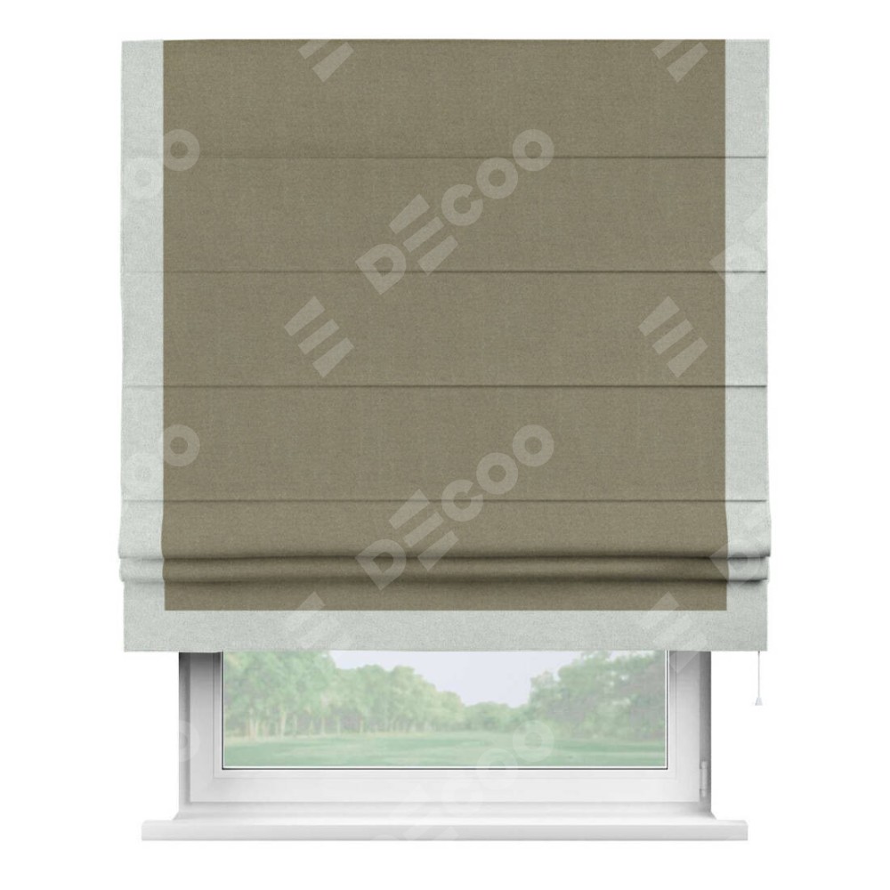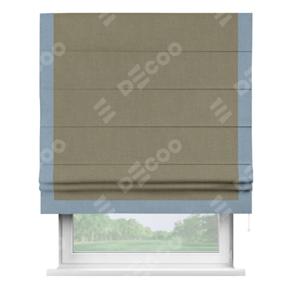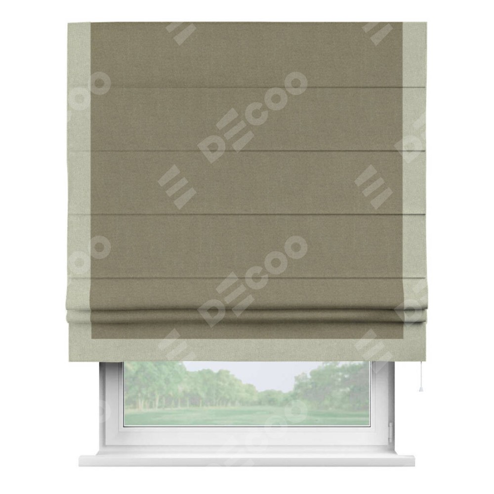 Римская штора производителя «Cortin», используется для проёма, пошита из ткани лён блэкаут бежевый, артикул 69435. Отделка шторы кантом «Виктория», ткань для канта используется из льна разной расцветки на выбор. Имеет универсальный механизм и подходит для монтажа: на потолок, на стену и в нишу.