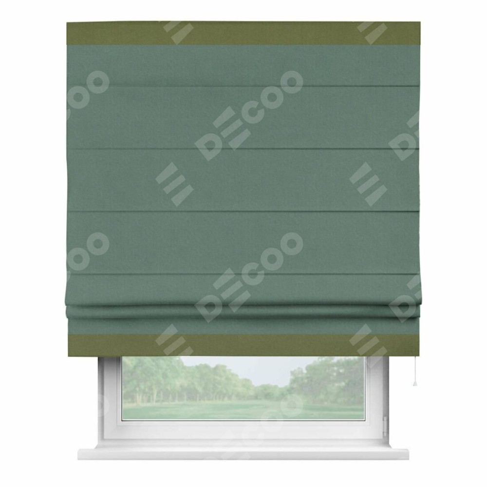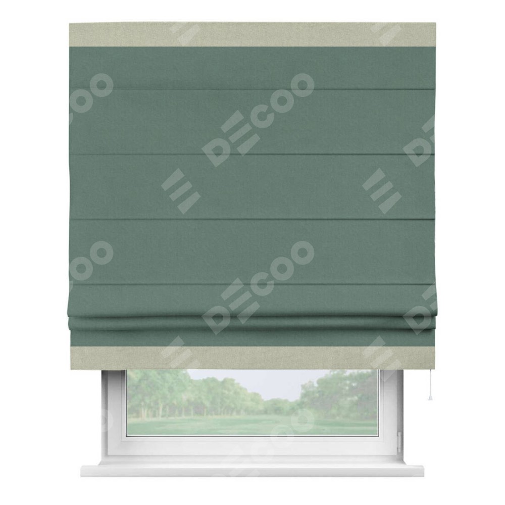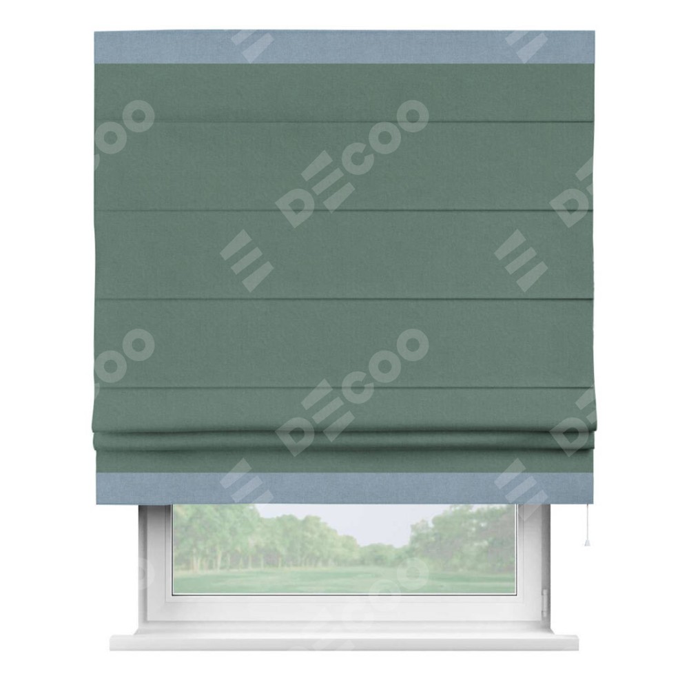 Римская штора производителя «Cortin», используется для проёма, пошита из ткани лён блэкаут бирюзовый, артикул 69517. Отделка шторы кантом «Горизонт», ткань для канта используется из льна разной расцветки на выбор. Имеет универсальный механизм и подходит для монтажа: на потолок, на стену и в нишу.