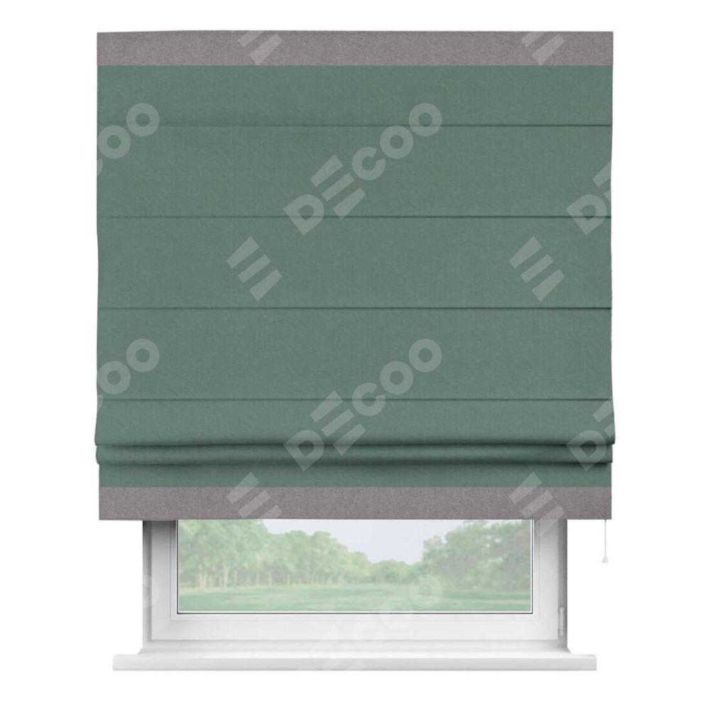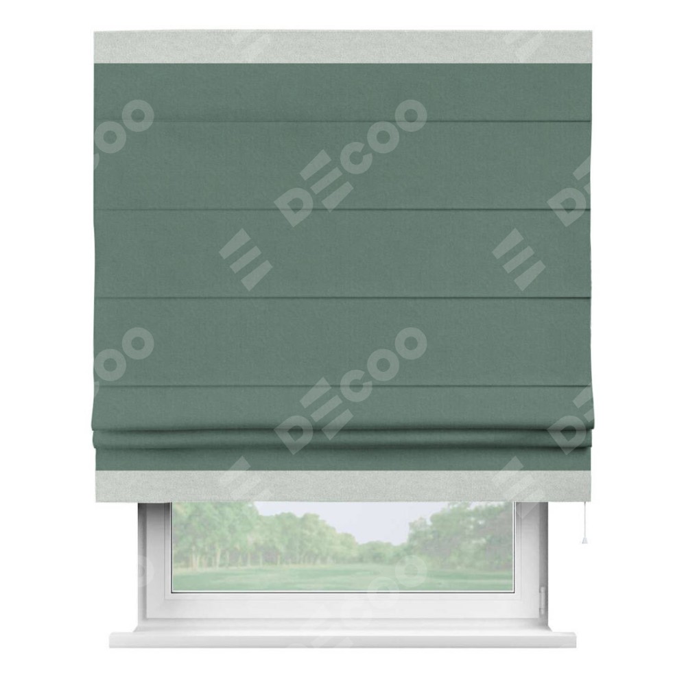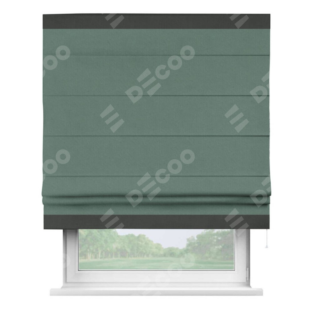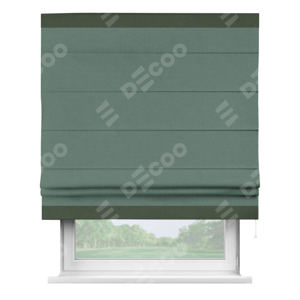 Римская штора производителя «Cortin», используется для проёма, пошита из ткани лён блэкаут бирюзовый, артикул 69517. Отделка шторы кантом «Горизонт», ткань для канта используется из льна разной расцветки на выбор. Имеет универсальный механизм и подходит для монтажа: на потолок, на стену и в нишу.