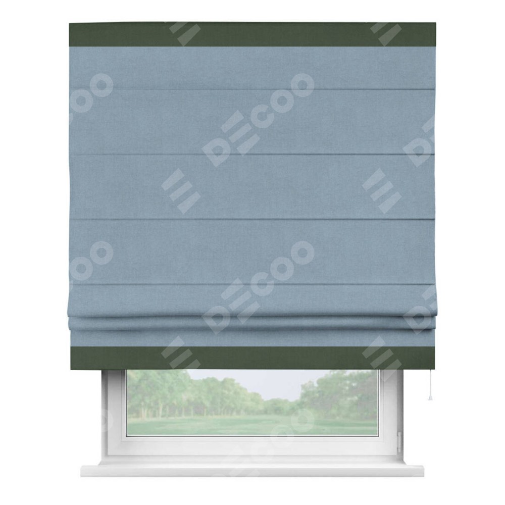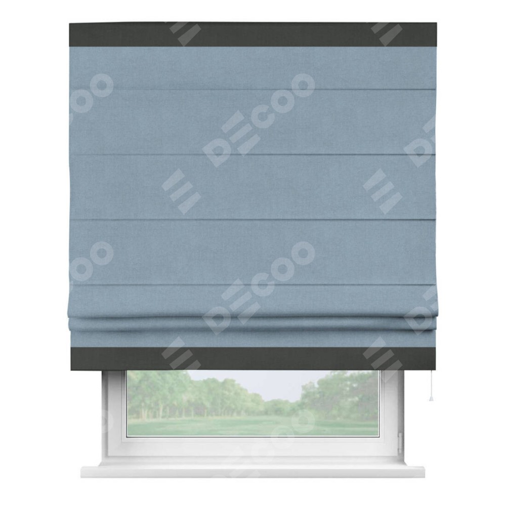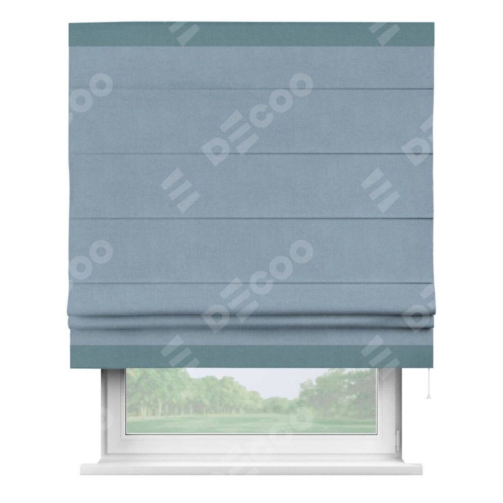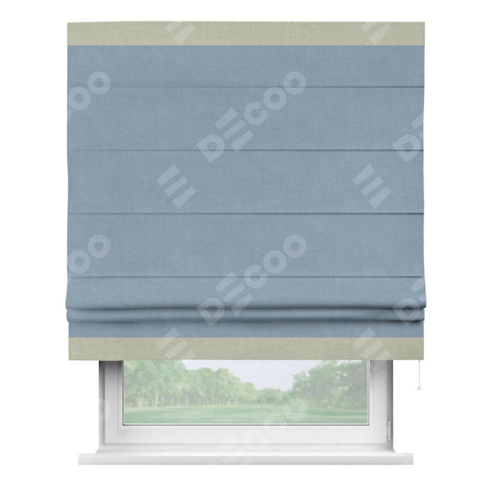 Римская штора производителя «Cortin», используется для проёма, пошита из ткани лён блэкаут голубой, артикул 69574. Отделка шторы кантом «Горизонт», ткань для канта используется из льна разной расцветки на выбор. Имеет универсальный механизм и подходит для монтажа: на потолок, на стену и в нишу.