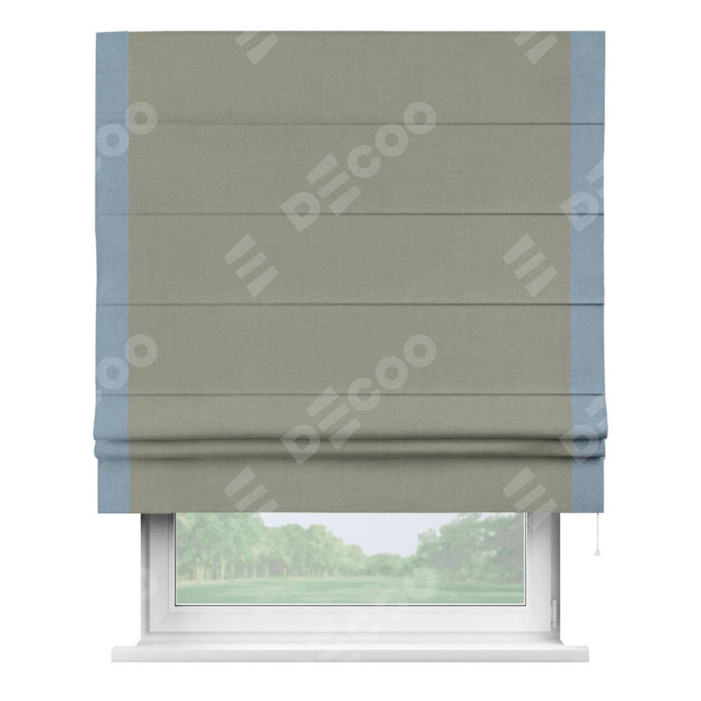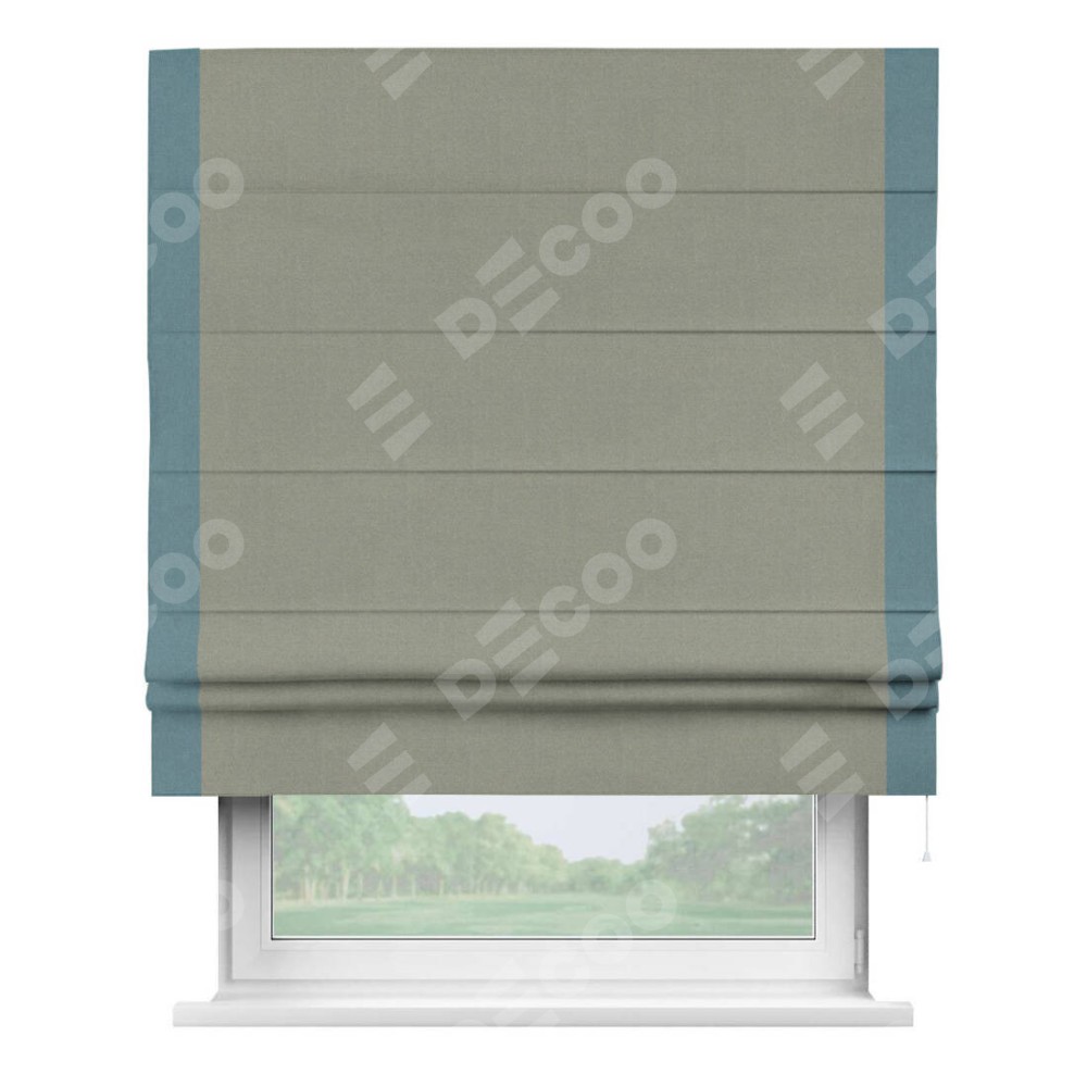 Римская штора производителя «Cortin», используется для проёма, пошита из ткани лён блэкаут светло-серый, артикул 69446. Отделка шторы кантом «Стрим Дуо», ткань для канта используется из льна разной расцветки на выбор. Имеет универсальный механизм и подходит для монтажа: на потолок, на стену и в нишу.