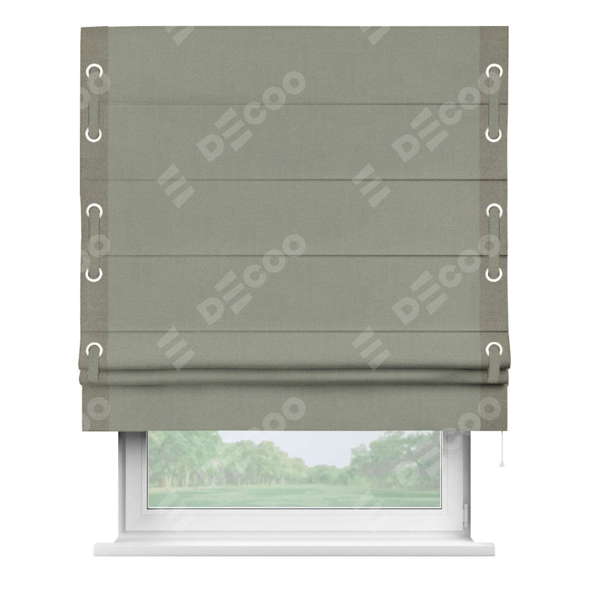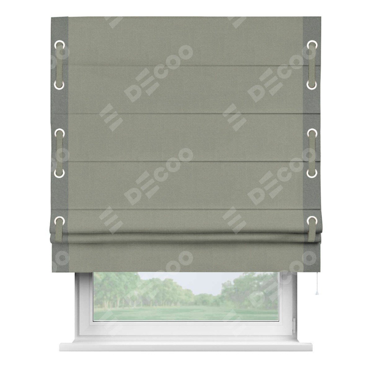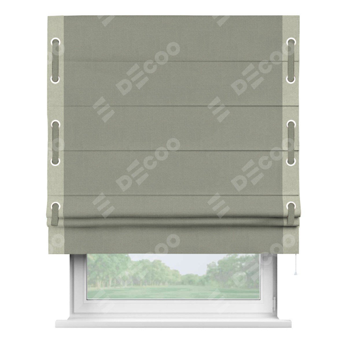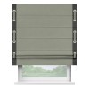 Римская штора производителя «Cortin», используется для проёма, пошита из ткани лён блэкаут светло-серый, артикул 69446. Отделка шторы кантом «Стрим Дуо» на кантах расположены люверсы с пояском, ткань для канта используется из льна разной расцветки на выбор. Ткань для пояска обычно используется из основной ткани шторы, а так же можно сделать из любой расцветки по желанию. Имеет универсальный механизм и подходит для монтажа: на потолок, на стену и в нишу.
