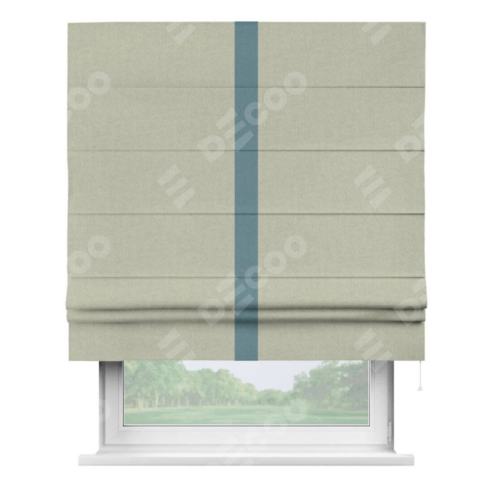 Римская штора производителя «Cortin», используется для проёма, пошита из ткани лён блэкаут серо-бежевый, артикул 69450. Отделка шторы кантом «Хайвэй», ткань для канта используется из льна разной расцветки на выбор. Имеет универсальный механизм и подходит для монтажа: на потолок, на стену и в нишу.