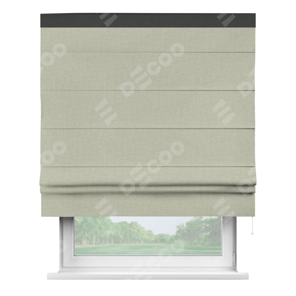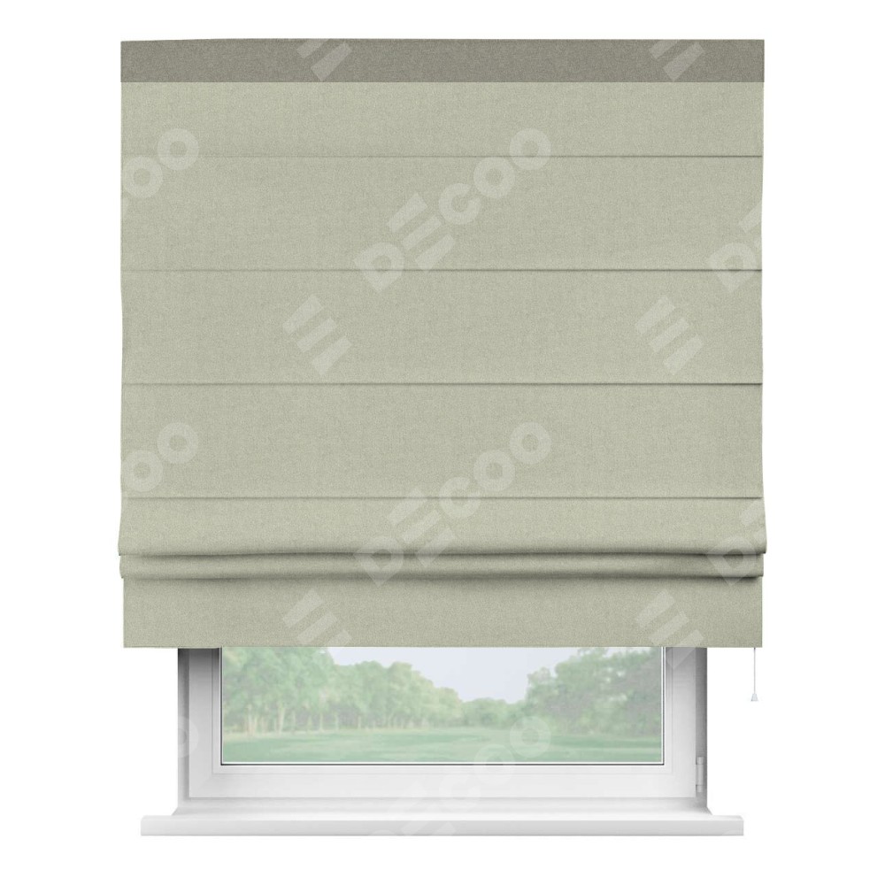 Римская штора производителя «Cortin», используется для проёма, пошита из ткани лён блэкаут серо-бежевый, артикул 69450. Отделка шторы кантом «Кинг», ткань для канта используется из льна разной расцветки на выбор. Имеет универсальный механизм и подходит для монтажа: на потолок, на стену и в нишу.