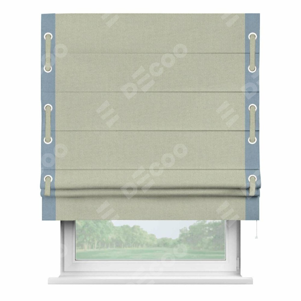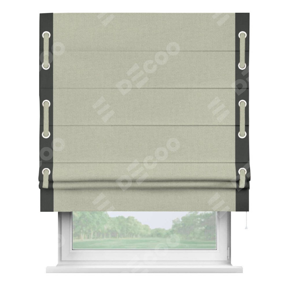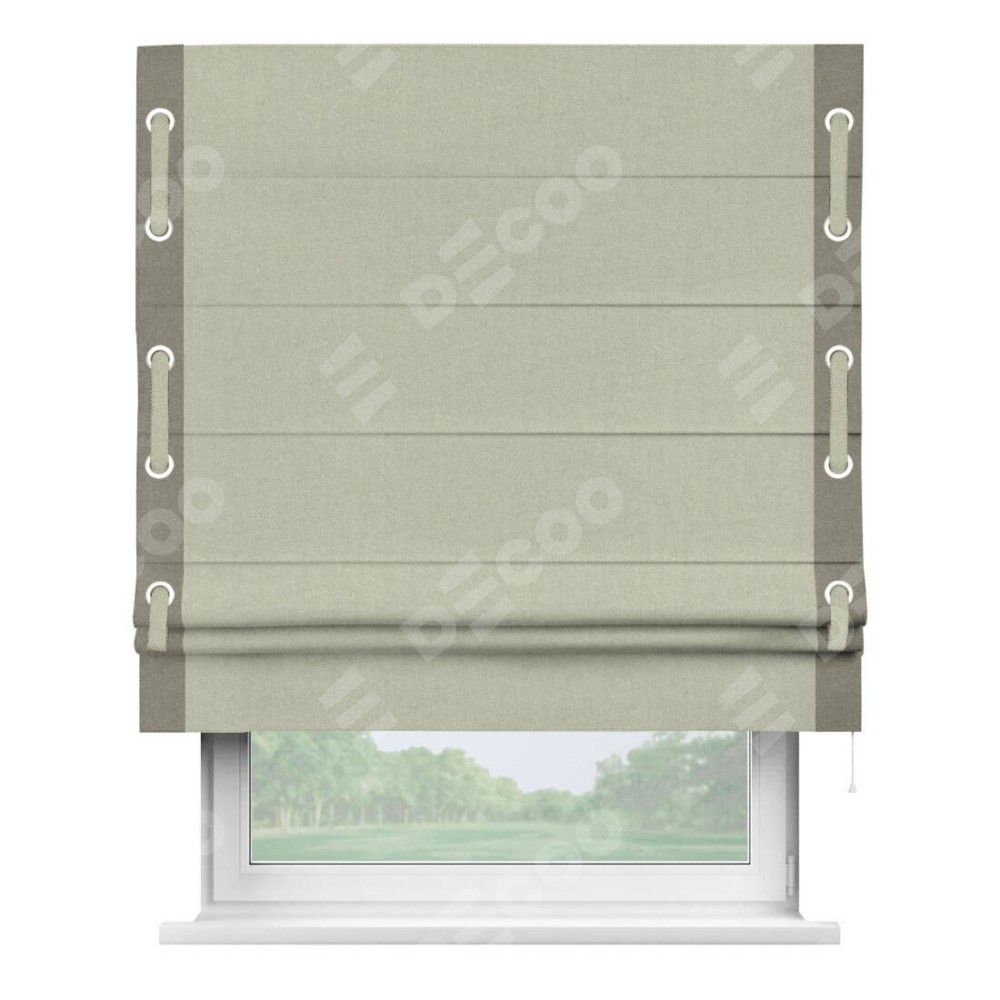 Римская штора производителя «Cortin», используется для проёма, пошита из ткани лён блэкаут серо-бежевый, артикул 69450. Отделка шторы кантом «Стрим Дуо» на кантах расположены люверсы с пояском, ткань для канта используется из льна разной расцветки на выбор. Ткань для пояска обычно используется из основной ткани шторы, а так же можно сделать из любой расцветки по желанию. Имеет универсальный механизм и подходит для монтажа: на потолок, на стену и в нишу.