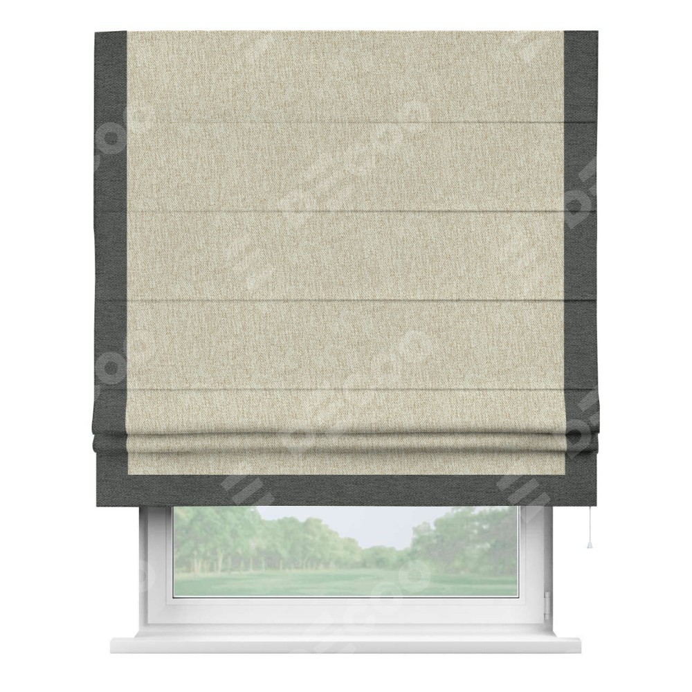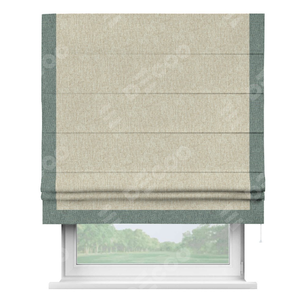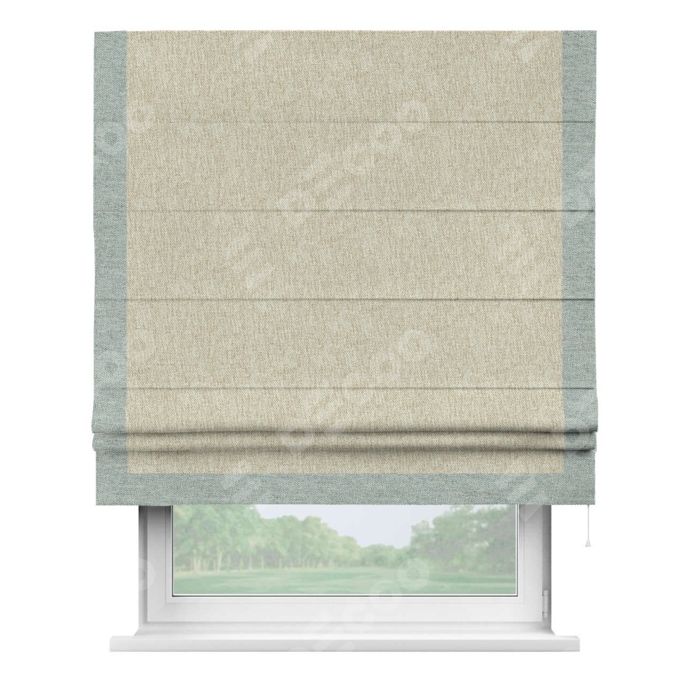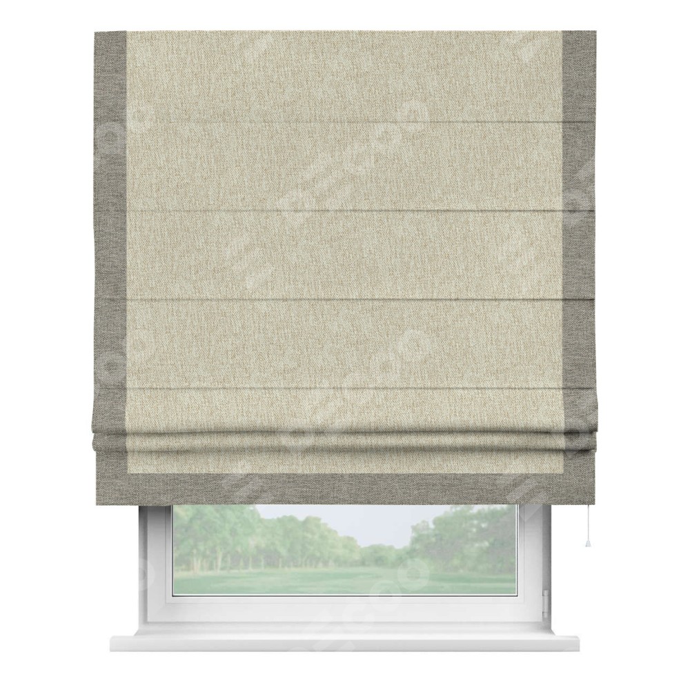 Римская штора производителя «Cortin», используется для проёма, пошита из ткани стиф димаут светло-бежевый, артикул 18084. Отделка шторы кантом «Виктория», ткань для канта используется из стифа разной расцветки на выбор. Имеет универсальный механизм и подходит для монтажа: на потолок, на стену и в нишу.