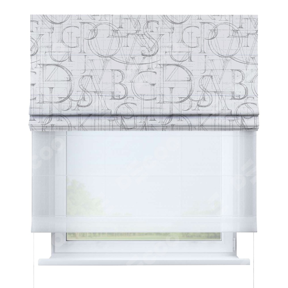 Римская штора день-ночь производителя «Cortin», используется для проёма, пошита из двух полотен, с лицевой блэкаут с нанесением сублимационной печати «Античные буквы», вторая ткань тюль (по стандарту комплектуется тюль белого цвета артикул V-01). Имеет универсальный механизм и подходит для монтажа: на потолок, на стену и в нишу.