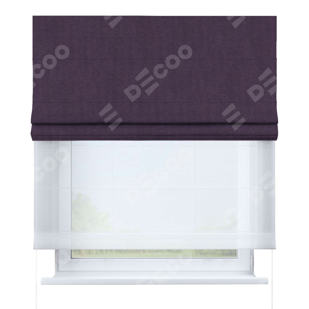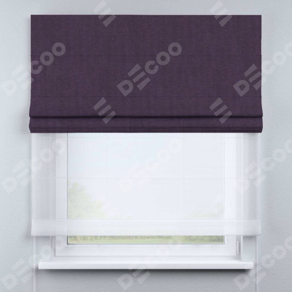 Римская штора день-ночь производителя «Cortin», используется для проёма, пошита из двух полотен, с лицевой стороны канвас баклажановый артикул v-111, вторая ткань тюль (по стандарту комплектуется тюль белого цвета артикул V-01). Имеет универсальный механизм и подходит для монтажа: на потолок, на стену и в нишу.