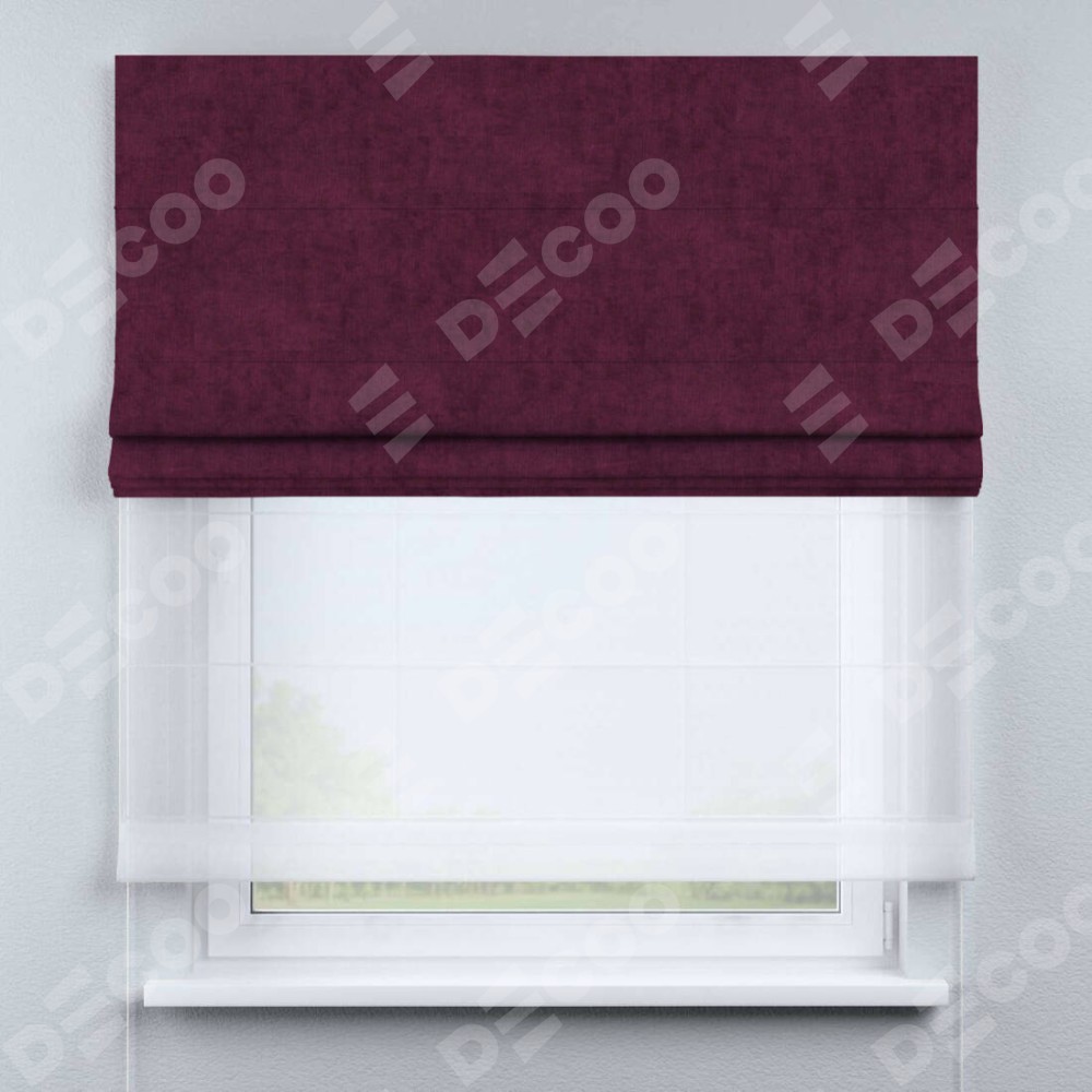 Римская штора день-ночь производителя «Cortin», используется для проёма, пошита из двух полотен, с лицевой стороны канвас фиолетовый артикул v-99, вторая ткань тюль (по стандарту комплектуется тюль белого цвета артикул V-01). Имеет универсальный механизм и подходит для монтажа: на потолок, на стену и в нишу.