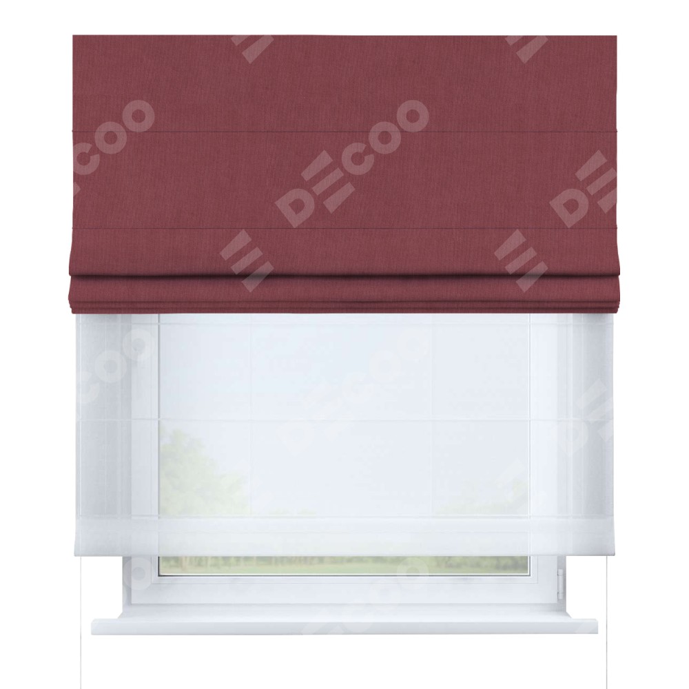 Римская штора день-ночь производителя «Cortin», используется для проёма, пошита из двух полотен, с лицевой стороны канвас ягодный артикул v-28, вторая ткань тюль (по стандарту комплектуется тюль белого цвета артикул V-01). Имеет универсальный механизм и подходит для монтажа: на потолок, на стену и в нишу.