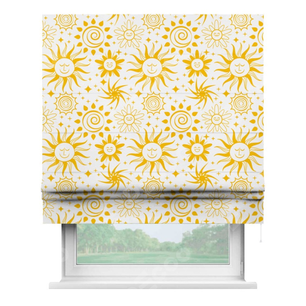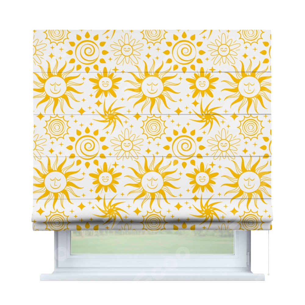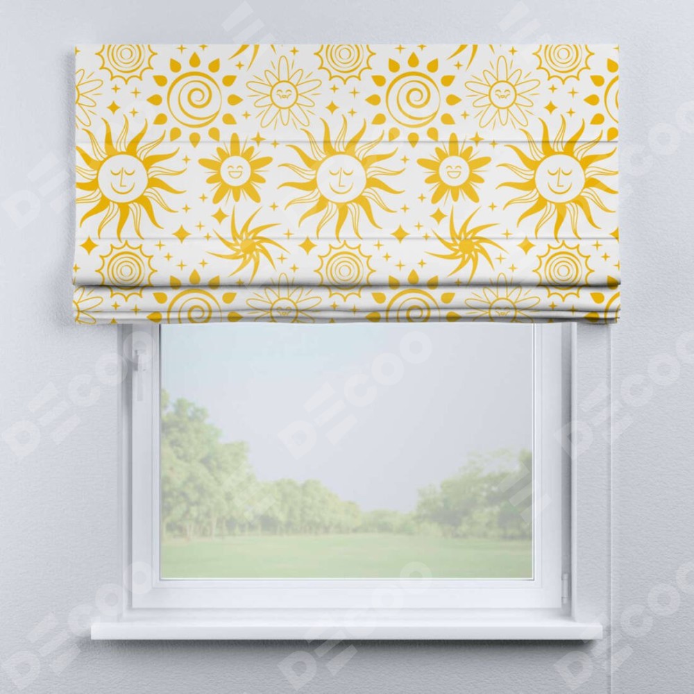 Римская штора производителя «Cortin», используется для проёма, пошита из ткани блэкаут с нанесением сублимационной печати «Солнышки». Имеет универсальный механизм и подходит для монтажа: на потолок, на стену и в нишу.
