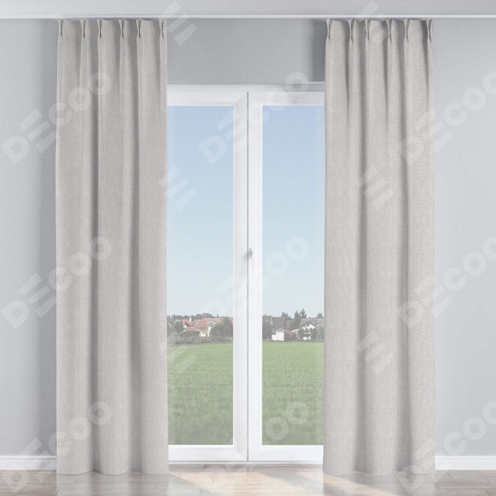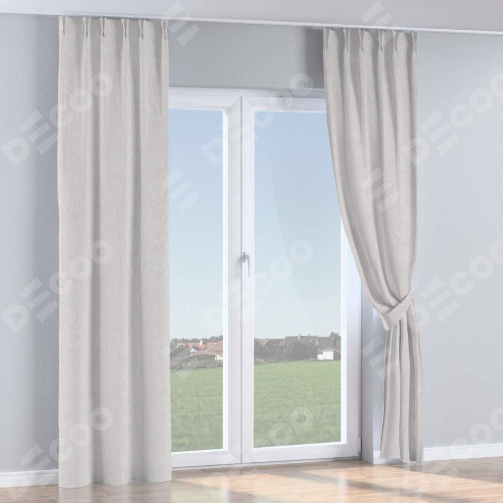 Комплект прямых штор, от производителя «Cortin», пошиты из ткани лён димаут светло-бежевый, артикул ткани 90993. С изнаночной стороны в верхней части штор пристрачивается шторная лента с декоративными складками «Кустик». Для создания элегантных складок прямые шторы шьются по стандарту с коэффициентом 1:2 (на 100 см. ширины проёма 200 см. ширины ткани).