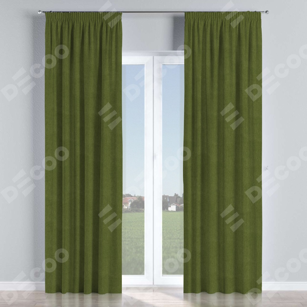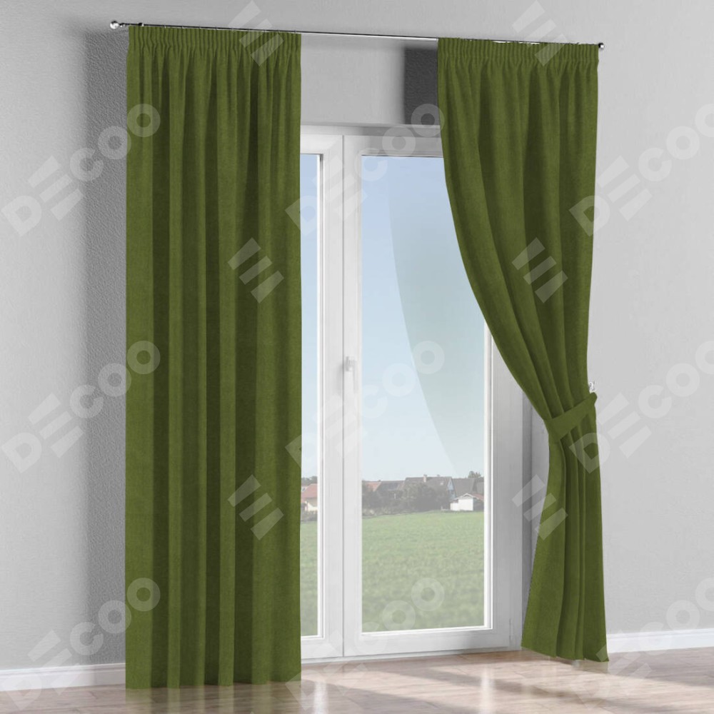 Комплект прямых штор, от производителя «Cortin», пошиты из ткани лён димаут салатовый, артикул ткани 91002. С изнаночной стороны в верхней части штор пристрачивается шторная лента с декоративными складками «Карандаш». Для создания элегантных складок прямые шторы шьются по стандарту с коэффициентом 1:2 (на 100 см. ширины проёма 200 см. ширины ткани).