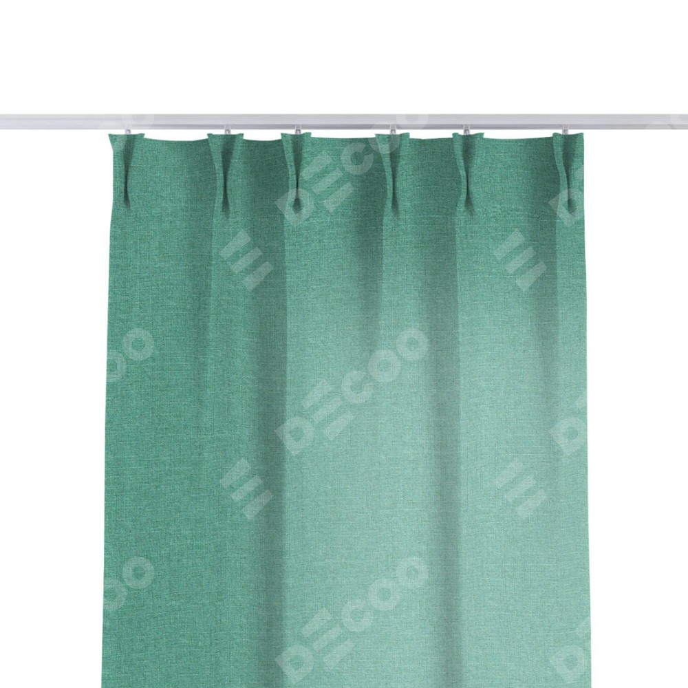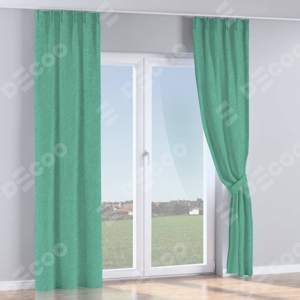 Комплект прямых штор, от производителя «Cortin», пошиты из ткани лён светло-бирюзовый, артикул ткани 53435. С изнаночной стороны в верхней части штор пристрачивается шторная лента с декоративными складками «Кустик». Для создания элегантных складок прямые шторы шьются по стандарту с коэффициентом 1:2 (на 100 см. ширины проёма 200 см. ширины ткани).