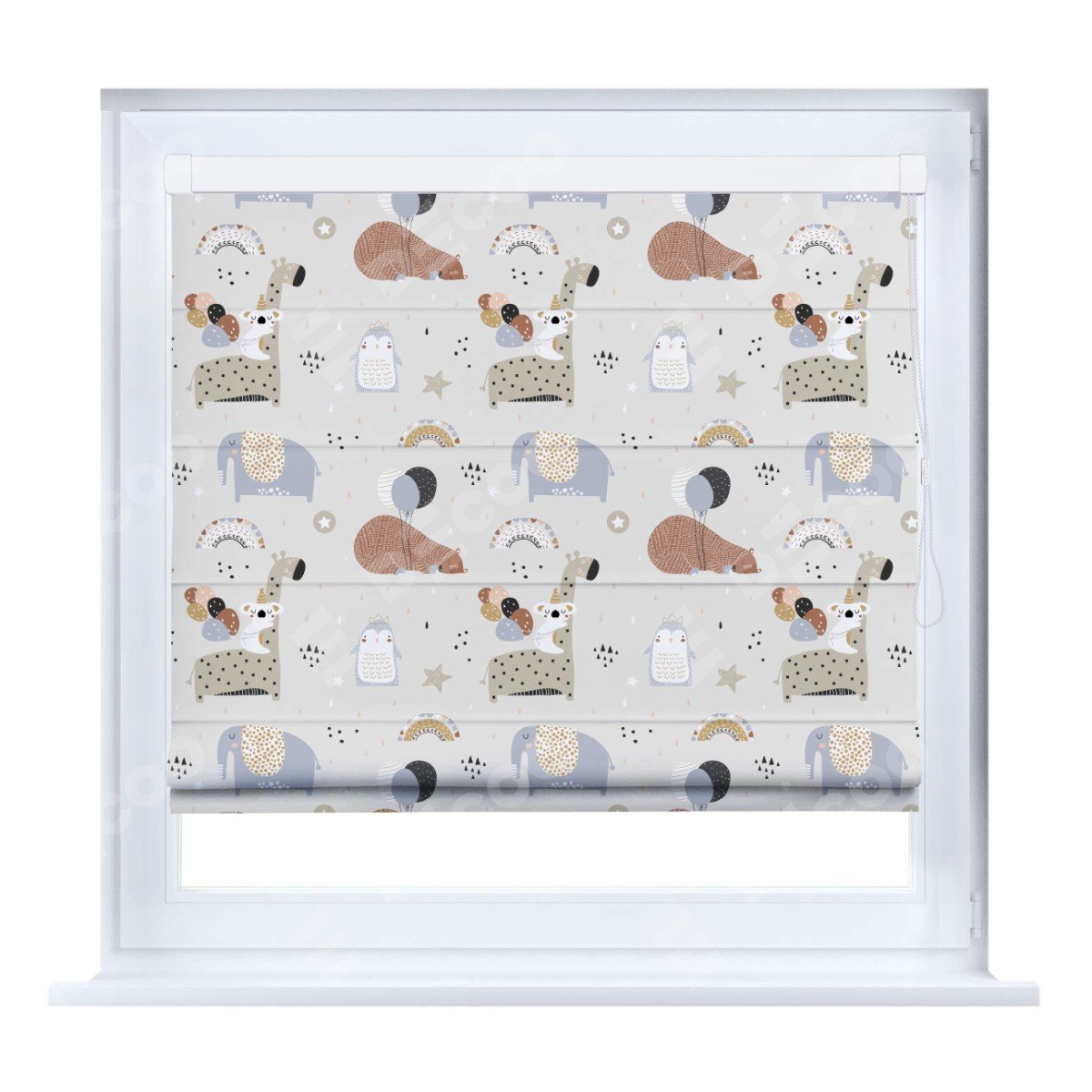 Римская штора кассетного типа, производителя «Cortin», устанавливается только на пластиковые окна и прилегает к стеклопакету, пошита из ткани блэкаут с нанесением сублимационной печати «Вечеринка животных».
