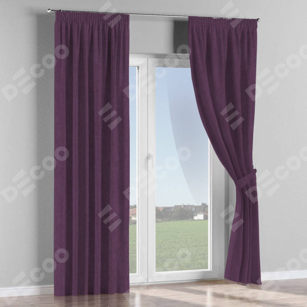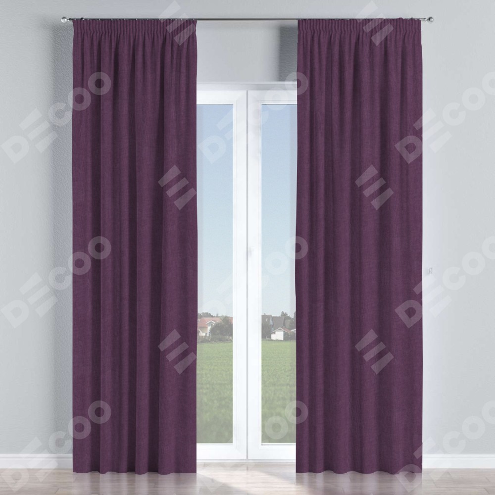 Комплект прямых штор, от производителя «Cortin», пошиты из ткани канвас баклажановый, артикул ткани v-111. С изнаночной стороны в верхней части штор пристрачивается шторная лента с декоративными складками «Карандаш». Для создания элегантных складок прямые шторы шьются по стандарту с коэффициентом 1:2 (на 100 см. ширины проёма 200 см. ширины ткани).