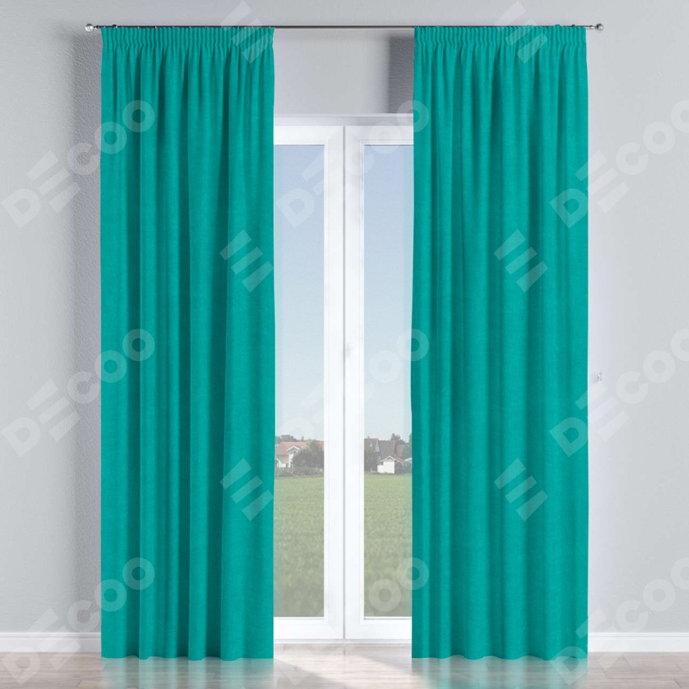 Комплект прямых штор, от производителя «Cortin», пошиты из ткани канвас бирюзовый, артикул ткани v-1048. С изнаночной стороны в верхней части штор пристрачивается шторная лента с декоративными складками «Карандаш». Для создания элегантных складок прямые шторы шьются по стандарту с коэффициентом 1:2 (на 100 см. ширины проёма 200 см. ширины ткани).