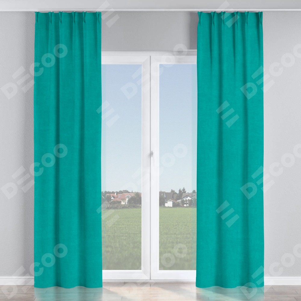 Комплект прямых штор, от производителя «Cortin», пошиты из ткани канвас бирюзовый, артикул ткани v-1048. С изнаночной стороны в верхней части штор пристрачивается шторная лента с декоративными складками «Кустик». Для создания элегантных складок прямые шторы шьются по стандарту с коэффициентом 1:2 (на 100 см. ширины проёма 200 см. ширины ткани).
