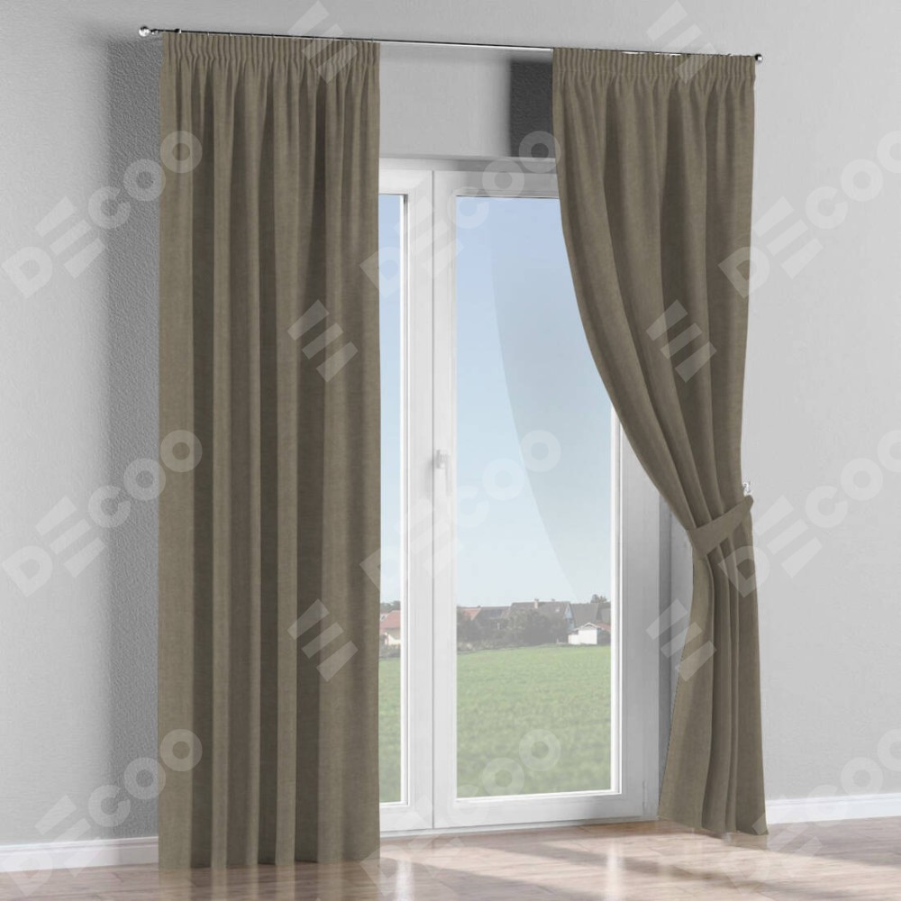 Комплект прямых штор, от производителя «Cortin», пошиты из ткани канвас серо-бежевый, артикул ткани v-224. С изнаночной стороны в верхней части штор пристрачивается шторная лента с декоративными складками «Карандаш». Для создания элегантных складок прямые шторы шьются по стандарту с коэффициентом 1:2 (на 100 см. ширины проёма 200 см. ширины ткани).