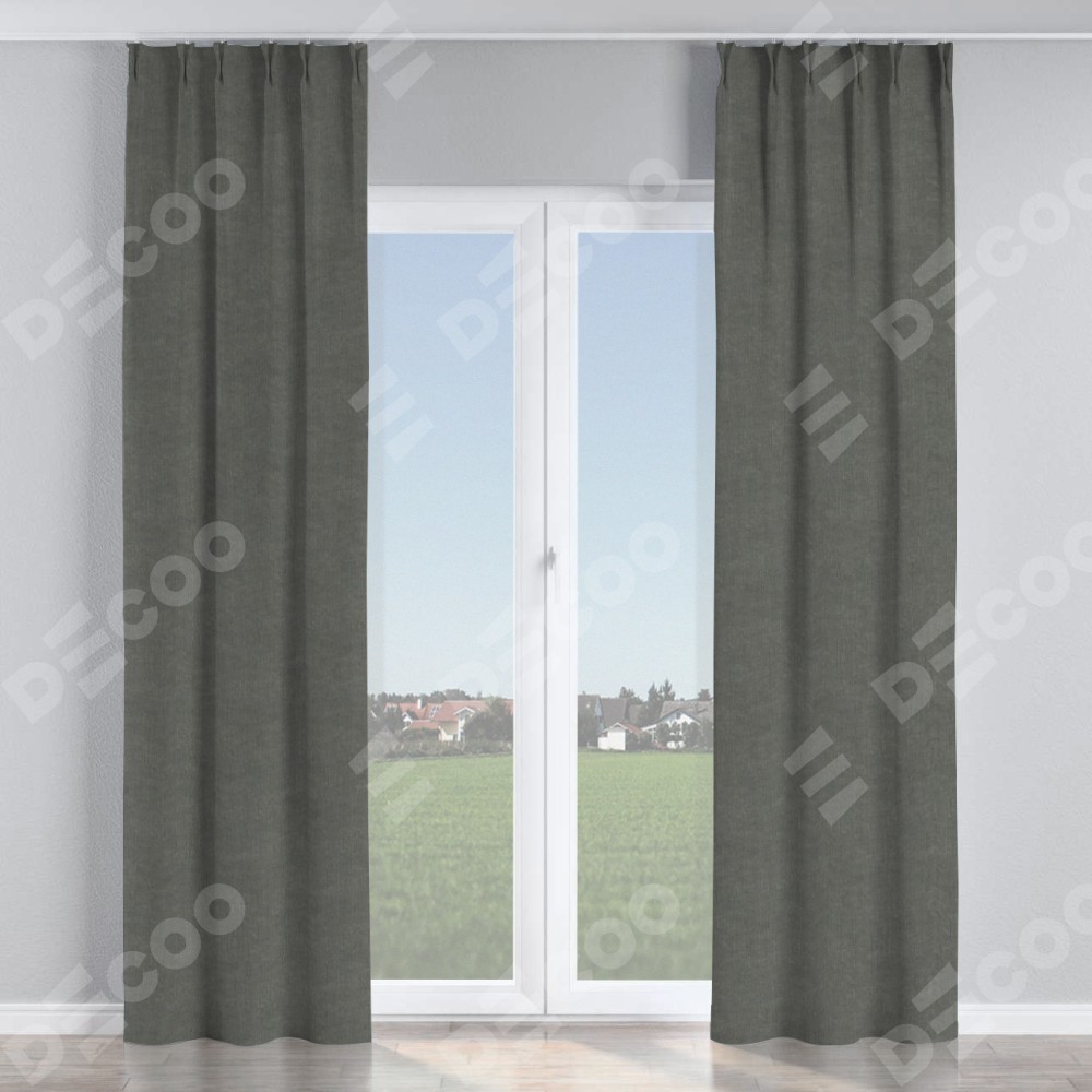 Комплект прямых штор, от производителя «Cortin», пошиты из ткани канвас тёмно-серый, артикул ткани v-340. С изнаночной стороны в верхней части штор пристрачивается шторная лента с декоративными складками «Кустик». Для создания элегантных складок прямые шторы шьются по стандарту с коэффициентом 1:2 (на 100 см. ширины проёма 200 см. ширины ткани).