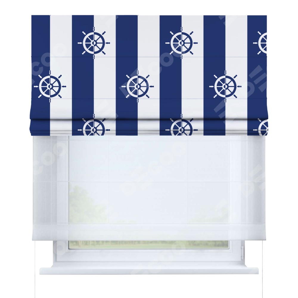 Римская штора день-ночь производителя «Cortin», используется для проёма, пошита из двух полотен, с лицевой блэкаут с нанесением сублимационной печати «Полоски и штурвалы», вторая ткань тюль (по стандарту комплектуется тюль белого цвета артикул V-01). Имеет универсальный механизм и подходит для монтажа: на потолок, на стену и в нишу.