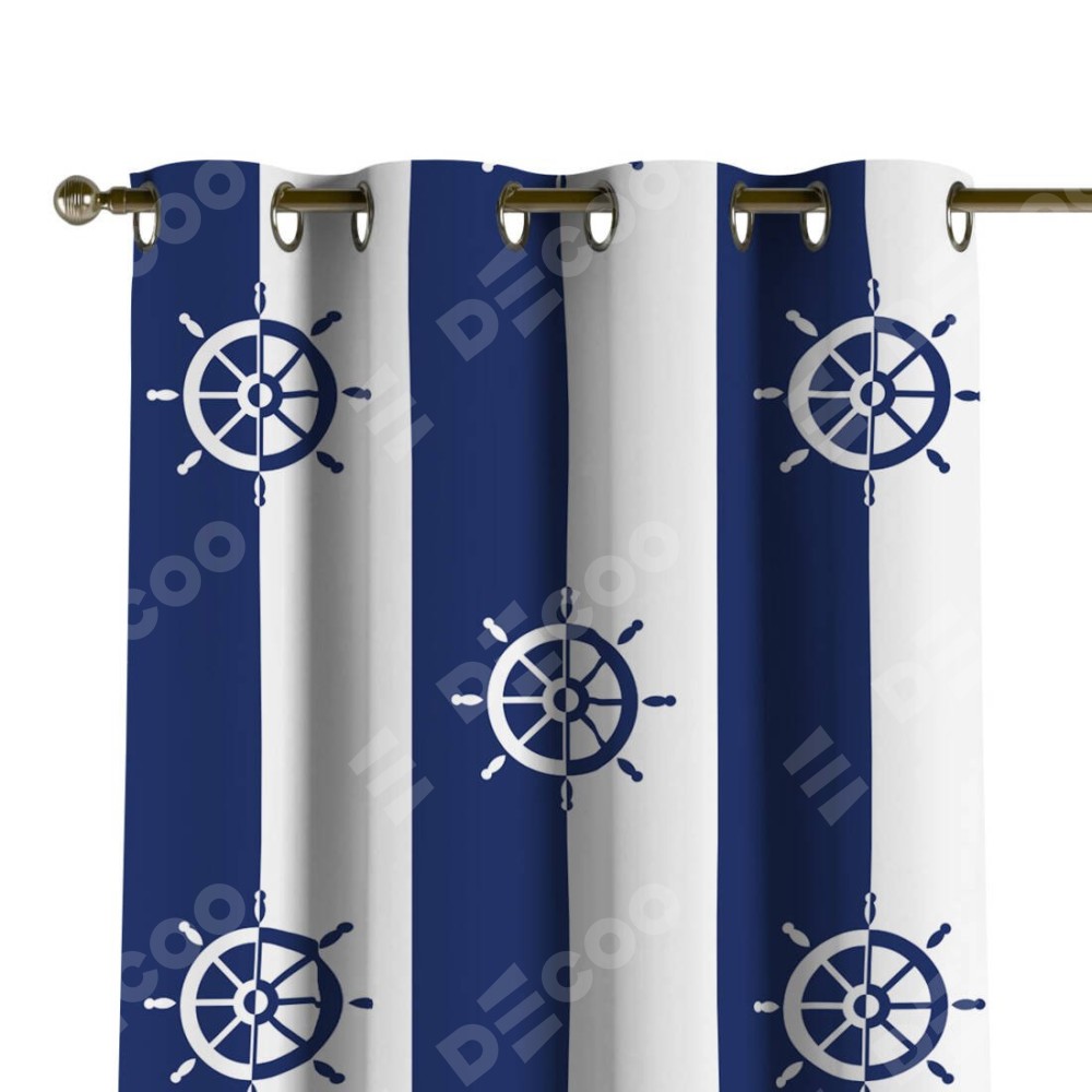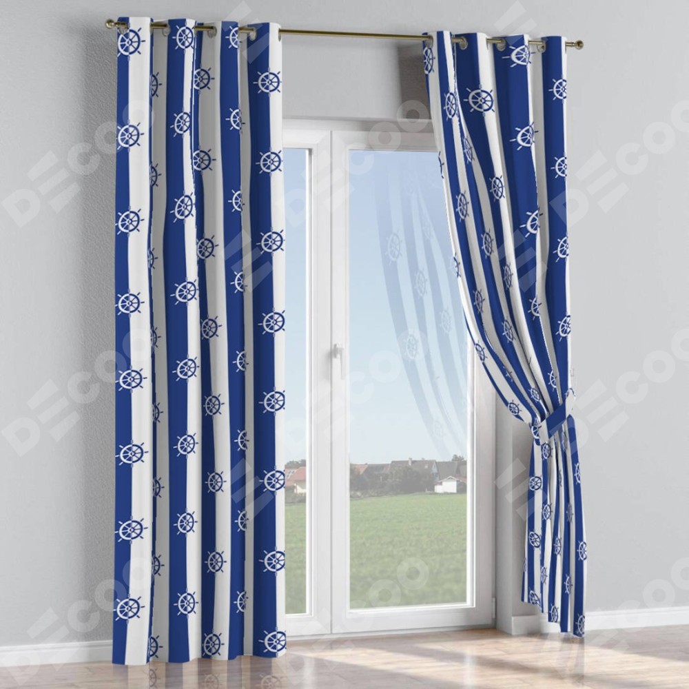 Комплект прямых штор, от производителя «Cortin», пошиты из ткани блэкаут с нанесением сублимационной печати «Полоски и штурвалы». Данная модель пошита на люверсах, комплектуется на выбор круглым карнизом и подходит для монтажа на стену или потолок. Прямые шторы на люверсах шьются по стандарту с коэффициентом 1/2 (на 100 см. ширины проёма 200 см. ширины ткани), отличительным преимуществом данной модели является простой способ монтажа. Достаточно повесить ее на трубу и штора готова!