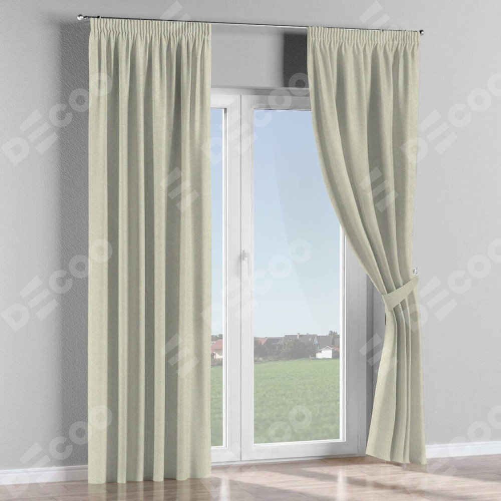 Комплект прямых штор, от производителя «Cortin», пошиты из ткани твид блэкаут шампань, артикул ткани 90929. С изнаночной стороны в верхней части штор пристрачивается шторная лента с декоративными складками «Карандаш». Для создания элегантных складок прямые шторы шьются по стандарту с коэффициентом 1:2 (на 100 см. ширины проёма 200 см. ширины ткани).