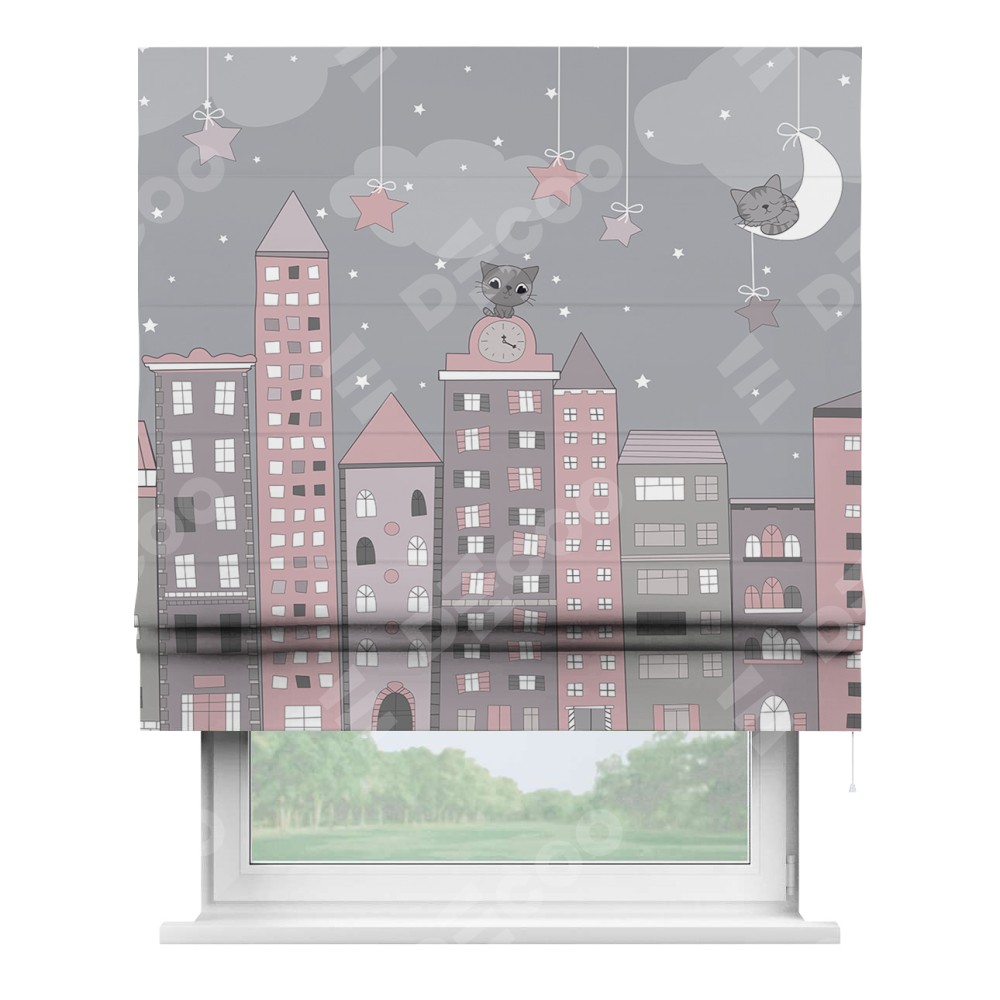 Римская штора производителя «Cortin», используется для проёма, пошита из ткани блэкаут с нанесением сублимационной печати «Вечерний город». Имеет универсальный механизм и подходит для монтажа: на потолок, на стену и в нишу.