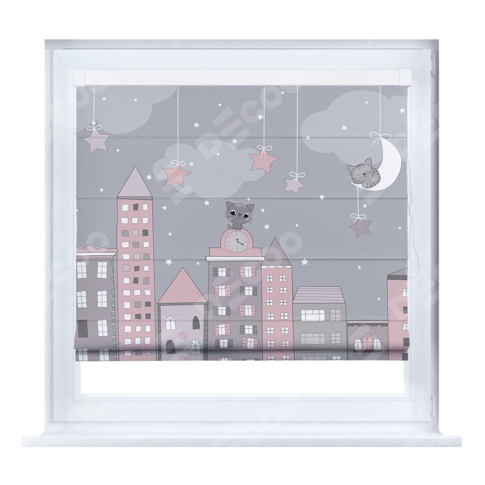 Римская штора кассетного типа, производителя «Cortin», устанавливается только на пластиковые окна и прилегает к стеклопакету, пошита из ткани блэкаут с нанесением сублимационной печати «Вечерний город».