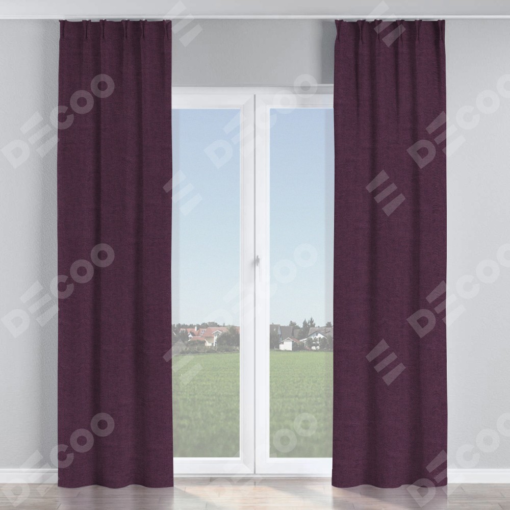 Комплект прямых штор, от производителя «Cortin», пошиты из ткани лён димаут фиолетовый, артикул ткани 16267. С изнаночной стороны в верхней части штор пристрачивается шторная лента с декоративными складками «Кустик». Для создания элегантных складок прямые шторы шьются по стандарту с коэффициентом 1:2 (на 100 см. ширины проёма 200 см. ширины ткани).