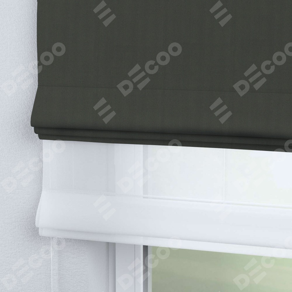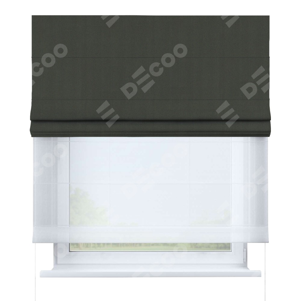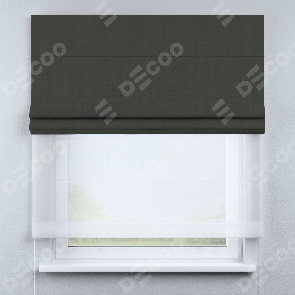 Двойная римская штора «День-ночь» от производителя Cortin предназначена для использования в проёмах. Эта штора уникальна тем, что состоит из двух полотен. На лицевой стороне находится однотонный дымчато-серый блэкаут (артикул: 91571−1), обеспечивающий эффективное затемнение. В комплект также входит вторая ткань — легкий белый тюль (артикул: V-01), который добавляет изящества и легкости оформлению окна. Кроме того, доступны и другие разновидности ткани тюль, выбор которых доступен по ссылке .