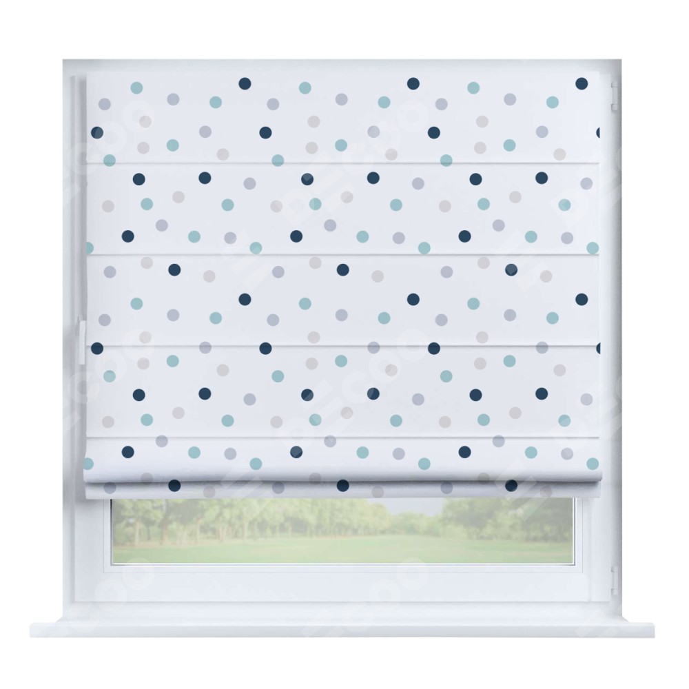 Римская штора производителя «Cortin», устанавливается на створку окна, пошита из ткани блэкаут с нанесением сублимационной печати «Точки». Штора шьётся по индивидуальным размерам, для данного типа римской шторы возможная ширина от 35 до 150 см., высота до 250 см.