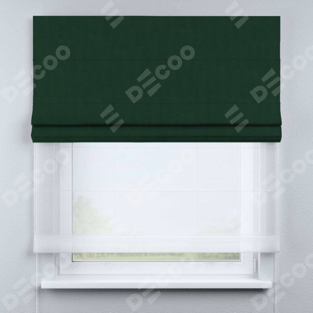 Двойная римская штора «День-ночь» от производителя Cortin предназначена для использования в проёмах. Эта штора уникальна тем, что состоит из двух полотен. На лицевой стороне находится однотонный зелёный блэкаут (артикул: 91572−2), обеспечивающий эффективное затемнение. В комплект также входит вторая ткань — легкий белый тюль (артикул: V-01), который добавляет изящества и легкости оформлению окна. Кроме того, доступны и другие разновидности ткани тюль, выбор которых доступен по  ссылке .