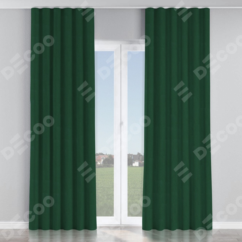 Комплект прямых штор, от производителя «Cortin», пошиты из ткани блэкаут однотонный зелёный, артикул ткани 91572−2. С изнаночной стороны в верхней части штор пристрачивается шторная лента с декоративными складками «Волна». Для создания элегантных складок прямые шторы шьются по стандарту с коэффициентом 1:2 (на 100 см. ширины проёма 200 см. ширины ткани).