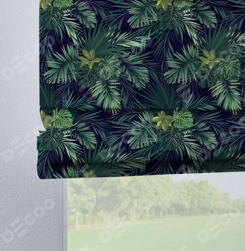 Римская штора производителя «Cortin», используется для проёма, пошита из ткани блэкаут с нанесением сублимационной печати «Пальмовые листья». Данная модель пошита на петлях, комплектуется на выбор круглым карнизом и подходит для монтажа на стену. Римская штора на петлях имеет простую систему регулировки высоты, отличительным преимуществом данной модели является простой способ монтажа. Достаточно повесить ее на трубу и штора готова!