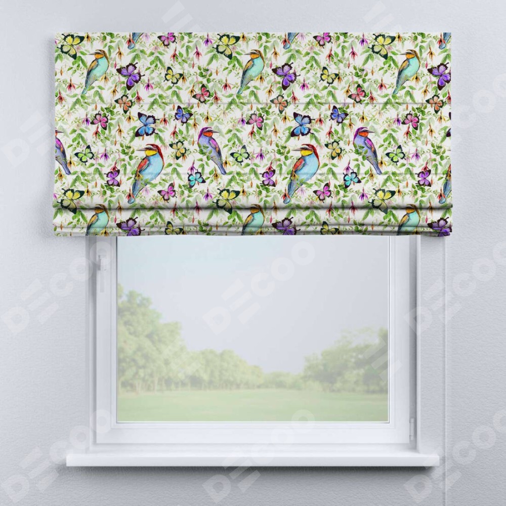 Римская штора производителя «Cortin», используется для проёма, пошита из ткани блэкаут с нанесением сублимационной печати «Тропические птицы». Имеет универсальный механизм и подходит для монтажа: на потолок, на стену и в нишу.