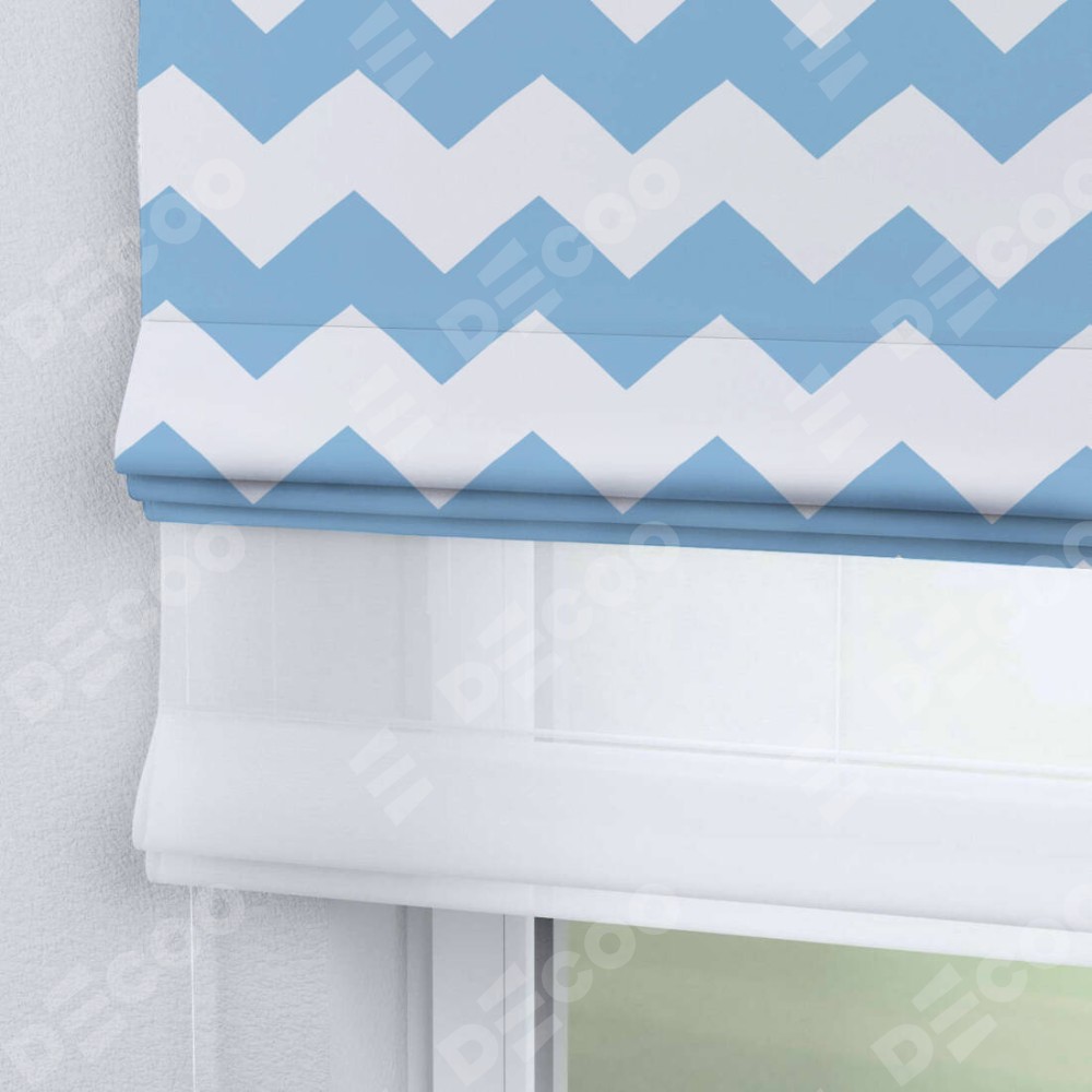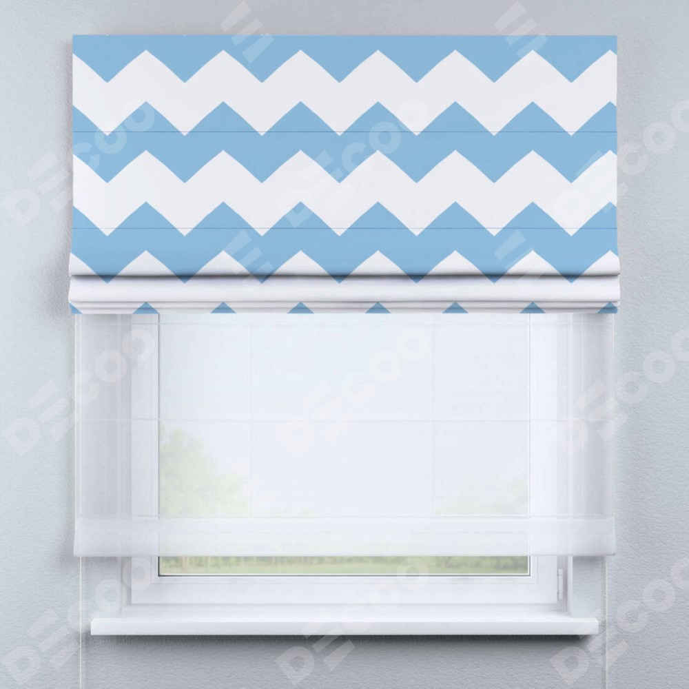 Римская штора день-ночь производителя «Cortin», используется для проёма, пошита из двух полотен, с лицевой блэкаут с нанесением сублимационной печати «Зигзаг крупный», вторая ткань тюль (по стандарту комплектуется тюль белого цвета артикул V-01). Имеет универсальный механизм и подходит для монтажа: на потолок, на стену и в нишу.