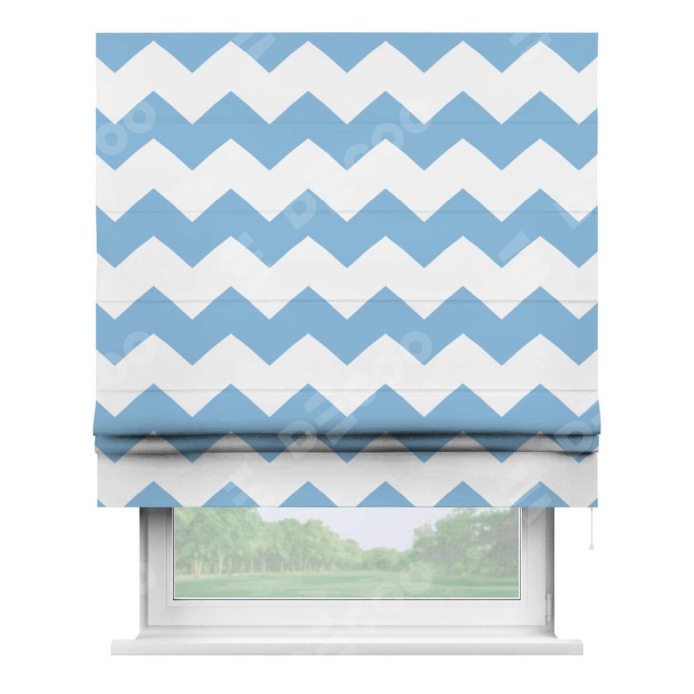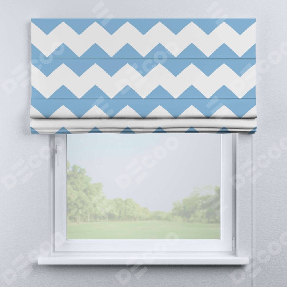 Римская штора производителя «Cortin», используется для проёма, пошита из ткани блэкаут с нанесением сублимационной печати «Зигзаг крупный». Имеет универсальный механизм и подходит для монтажа: на потолок, на стену и в нишу.