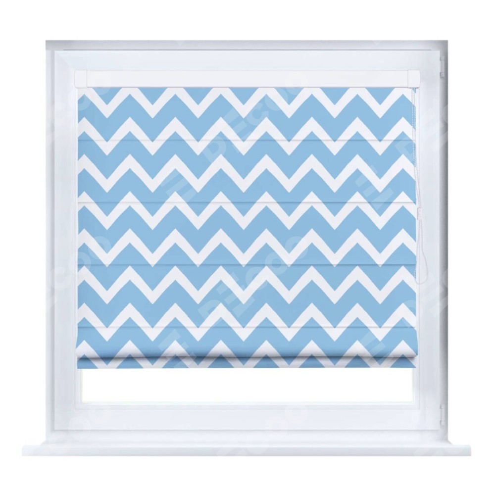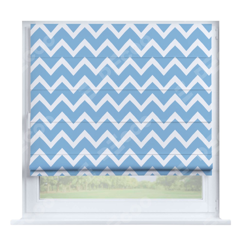 Римская штора производителя «Cortin», устанавливается на створку окна, пошита из ткани блэкаут с нанесением сублимационной печати «Зигзаг средний». Штора шьётся по индивидуальным размерам, для данного типа римской шторы возможная ширина от 35 до 150 см., высота до 250 см.