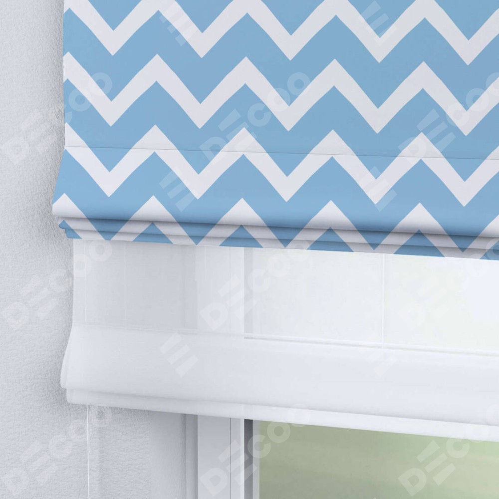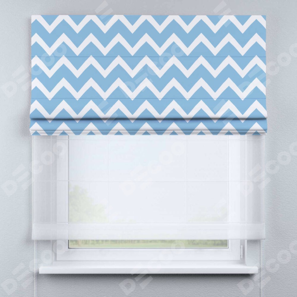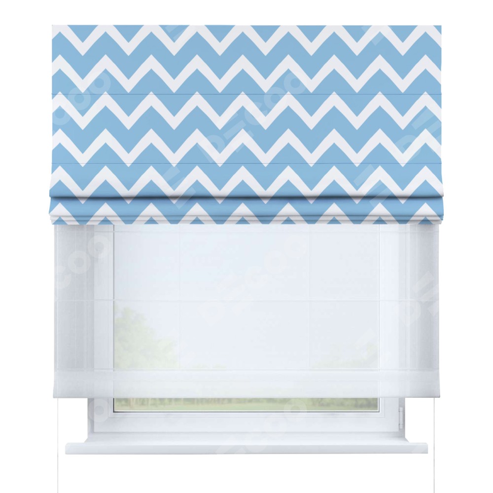 Римская штора день-ночь производителя «Cortin», используется для проёма, пошита из двух полотен, с лицевой блэкаут с нанесением сублимационной печати «Зигзаг средний», вторая ткань тюль (по стандарту комплектуется тюль белого цвета артикул V-01). Имеет универсальный механизм и подходит для монтажа: на потолок, на стену и в нишу.