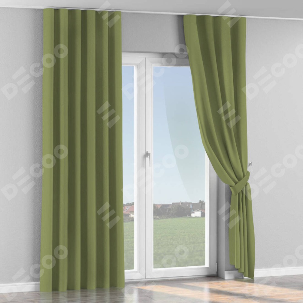 Комплект прямых штор, от производителя «Cortin», пошиты из ткани бархат золотая оливка, артикул ткани 90725. С изнаночной стороны в верхней части штор пристрачивается шторная лента с декоративными складками «Волна». Для создания элегантных складок прямые шторы шьются по стандарту с коэффициентом 1:2 (на 100 см. ширины проёма 200 см. ширины ткани).