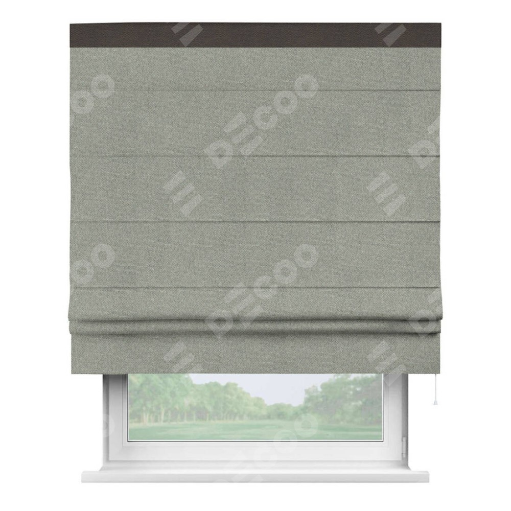 Римская штора производителя «Cortin», используется для проёма, пошита из ткани лён димаут серый, артикул 91009. Отделка шторы кантом «Кинг», ткань для канта используется из льна димаут разной расцветки на выбор. Имеет универсальный механизм и подходит для монтажа: на потолок, на стену и в нишу.